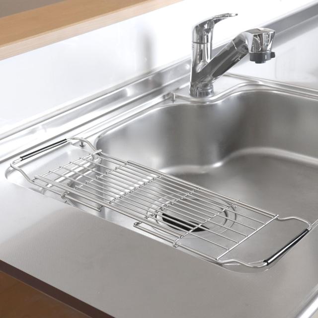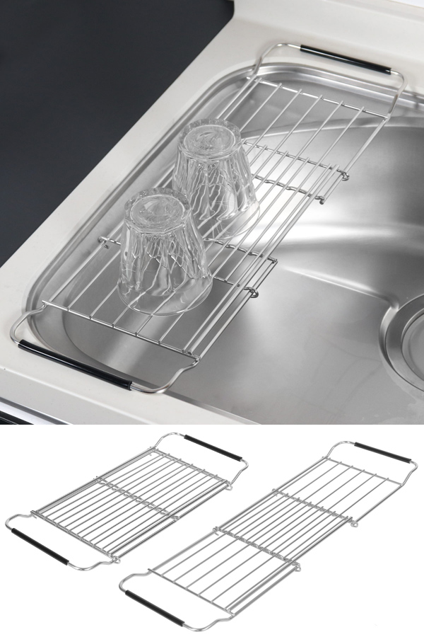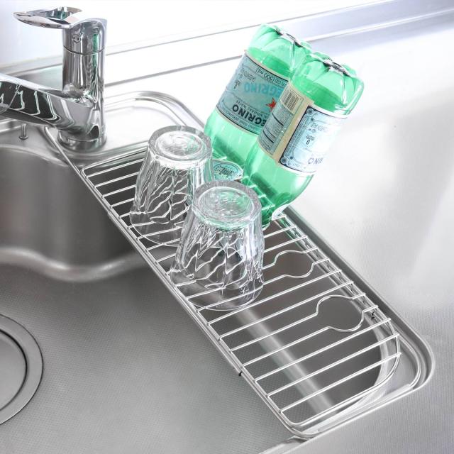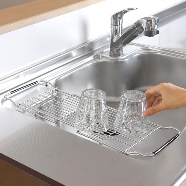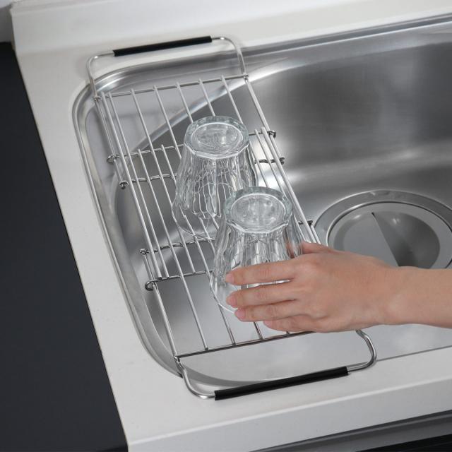 シンクに掛けて水切りができるスライドドレーナーです。シンク上で水切りができるので作業スペースを広く使うことができます。食洗機では洗えないものや、大切な食器やグラスだけを置く場所としてもおすすめです。耐久性に優れたステンレス製で変形しにくく、サビにくい特長もあるのでお手入れが簡単で色々な場所で愛用していただけます。