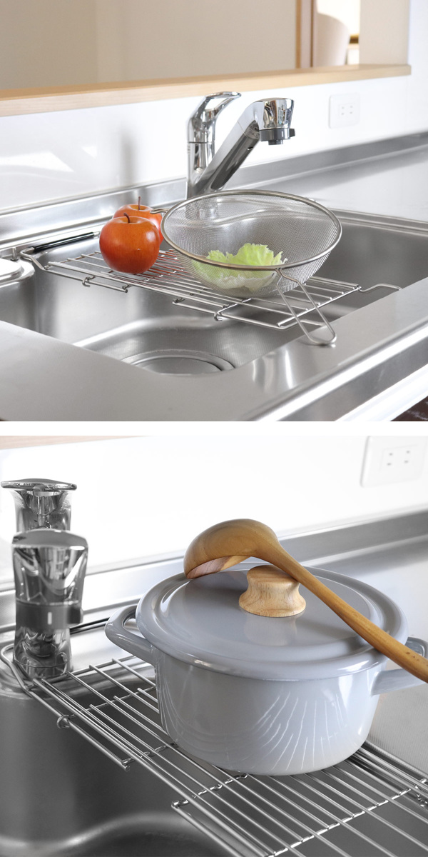 食器の水切りだけでなく、洗った野菜や果物の水切りもできます。また、ステンレスは耐熱性が優れているので、熱いお鍋やフライパンなどの一時置きにもおすすめです。