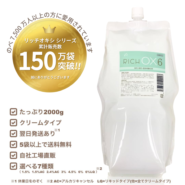 リッチ オキシ6% 2000ml ヘアカラー2剤 選べる7種の濃度% 3% 6% 1.5% 1.5AC 2.4AC 4.5% 6LQ (5袋以上送料無料,初回限定お試し価格,12袋迄購入可,高品質低価格,業務用オキシ,染毛剤,OX6,自社工場直販)