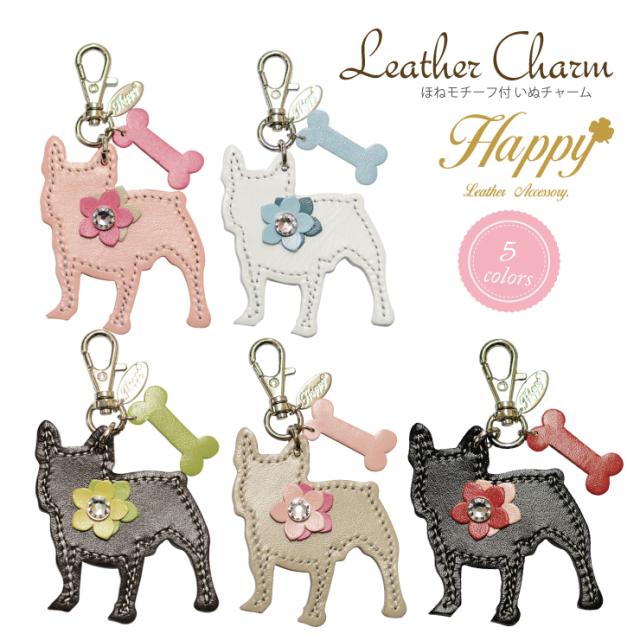【メール便対応】Happyチャーム -39 フレンチブルドック キーリング バッグチャーム シルエット 本革 牛革 日本製 ドッグ 犬 ほね フレブル ブルドッグ レザー スワロフスキー付 シンプル プレゼント ギフト贈り物 ハッピー バッグ 可愛い 上品 母の日┃