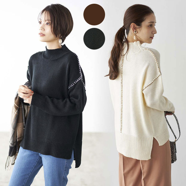 ハンドステッチ風オーバーニット タートルネック ハンドステッチニット 両脇スリット 秋冬春 レディース 婦人服 980051
