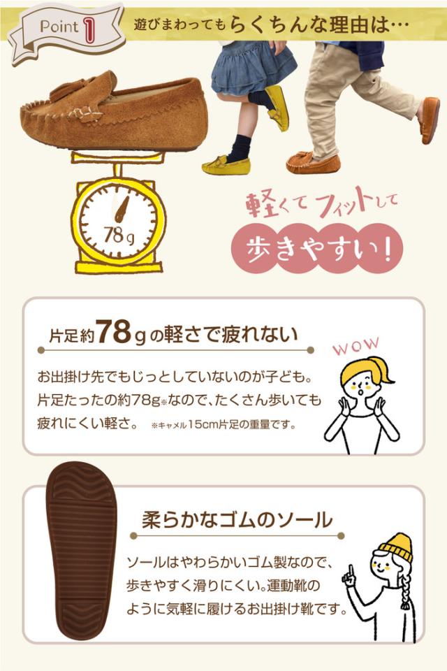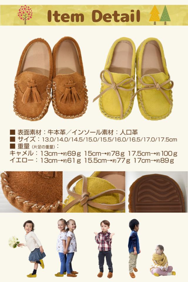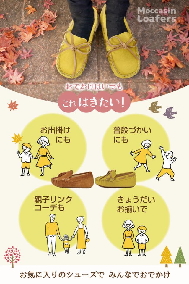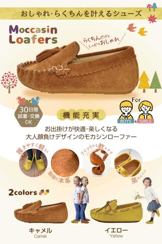キッズ ローファー モカシン | 女の子 男の子 茶 キャメル モカシン オシャレ ぺたんこ 黄色 イエロー ブラウン