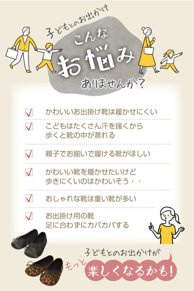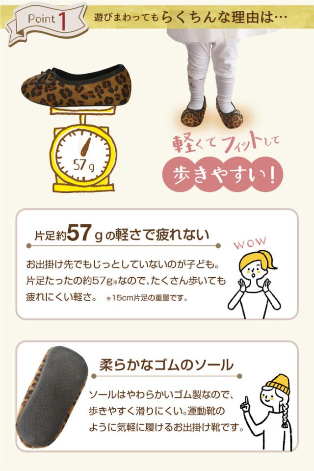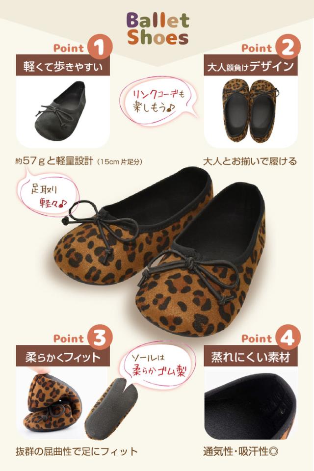 黒とレオパードの2色。黒はピアノの発表会や入園式などフォーマルな場面でも使えます。レオパードは履くだけで一気にコーディネートが華やかに。ママとお揃いコーデも。