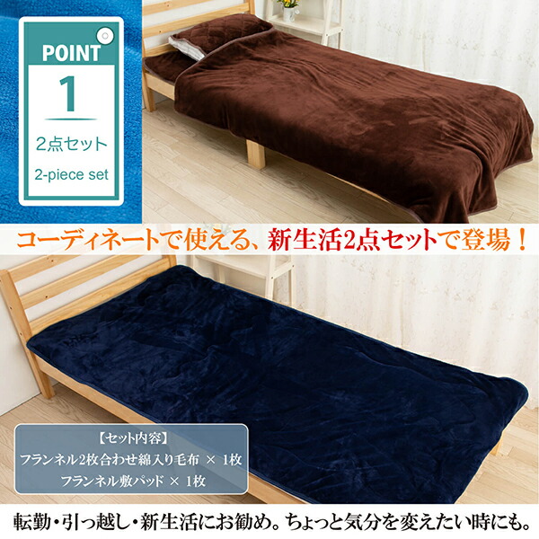 セット内容:フランネル2枚合わせ綿入り毛布 × 1枚 フランネル敷パッド × 1枚。