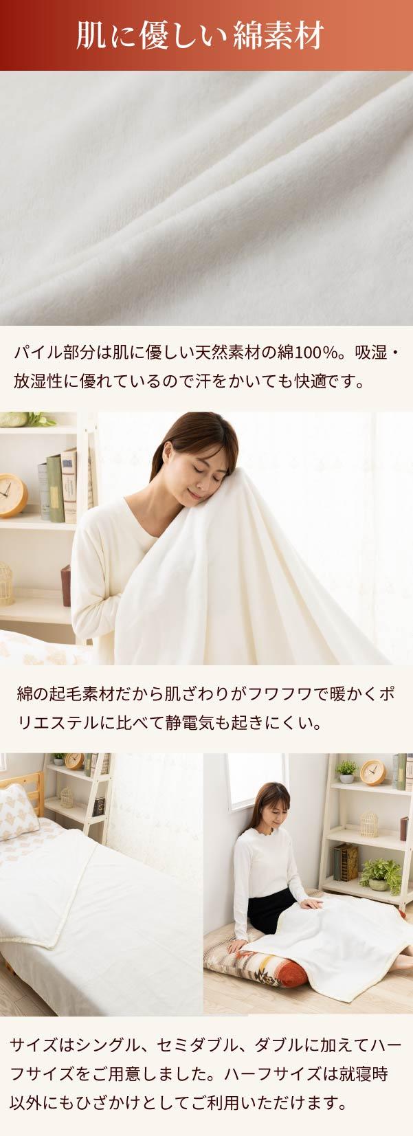 季節に合わせて毛布1枚でご使用頂くか、寒い冬には綿毛布の上に布団を掛けて頂くと温かさがUPします。