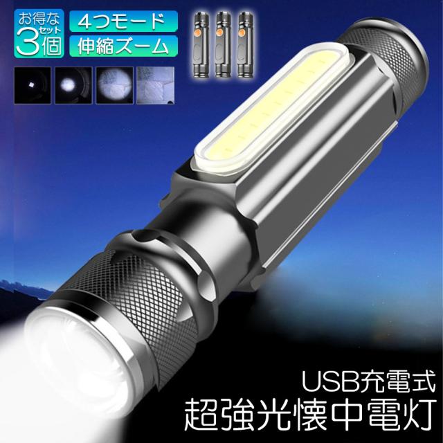 懐中電灯 LEDライト 充電式 ズーム付き 3個セット 充電式 COBライト ハンドライト USB充電 ズーム 超強光 作業灯 ワークライト クリップ マグネット アルミ合金素材 小型 軽量 防災 防水