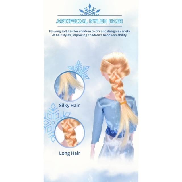 子供は、ひねった三つ編みで作られたエルサ人形の長いブロンドの髪で遊ぶのが大好きです。