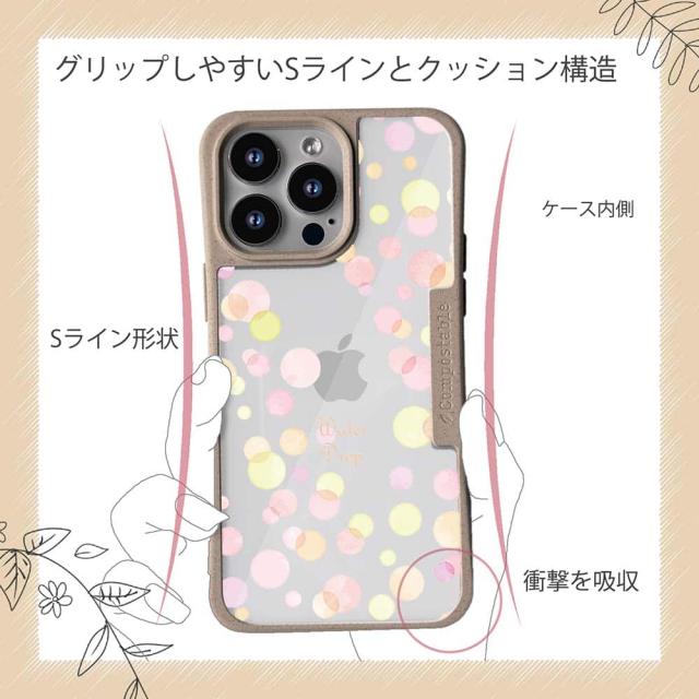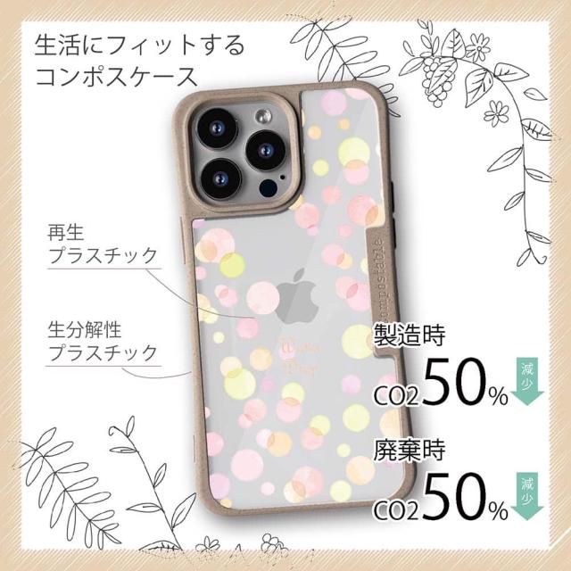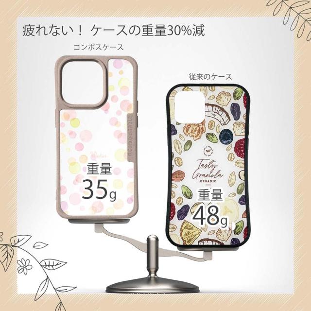 | 注意事項 | コンポスケースは、フレーム部分に「生分解性プラスチック」という環境に優しい素材を使用しております。そのため擦ったり、ぶつけたりする衝撃を与えると脆い部分もあります。耐衝撃ケースではないことをご了承ください。 Qi充電やMagSafe充電にも対応していますが、装着していない時に比べると充電速度は落ちます。 |