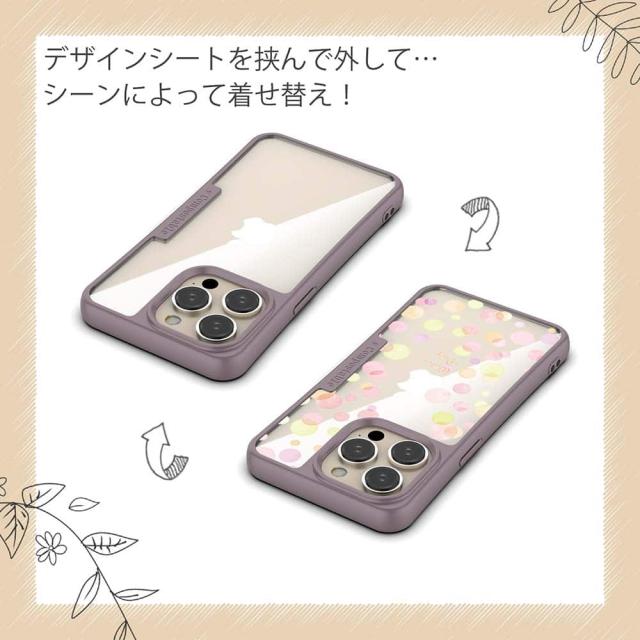 | ケースについて | 背面の内側に入れ込むデザインシートで、シーンに合わせて着せ替え可能。また、グリップしやすいクッション構造で、本体重量は約35gと軽減化を実現。さらにSライン形状で、究極に押しやすいボタン設計(切り込みが入ることで押し込む力を軽減)、背面のカメラ・レンズを保護する高さ設計となっております。生分解性プラスチック素材ながらも着脱もしやすく、割れない・指紋防止加工を施しています。 |