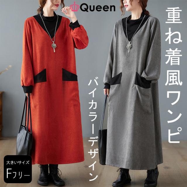 大きいサイズ レディース 重ね着風ワンピース Vネック オーバーサイズ バイカラー 無地 春 秋 冬 (566450)