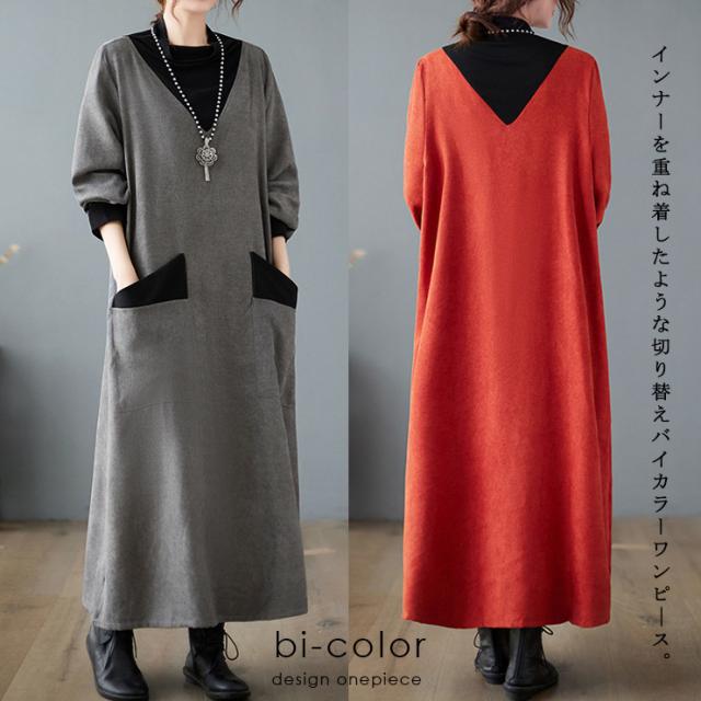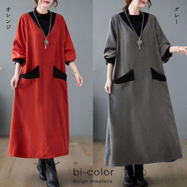 ★☆大きいサイズ レディース 重ね着風ワンピース Vネック オーバーサイズ バイカラー 無地 春 秋 冬 LL 3L 4L 5L 6L グレー オレンジ 新入荷 メール便不可☆★