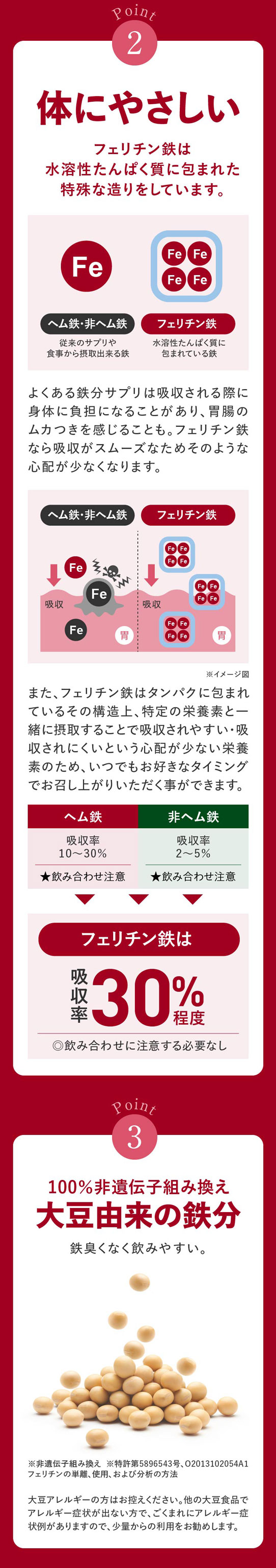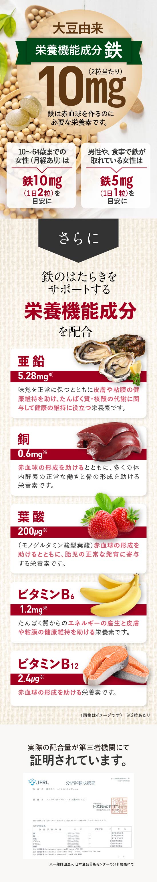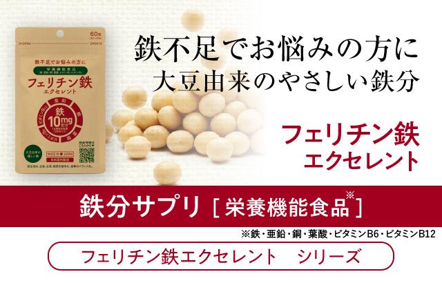 大豆由来の優しい鉄と言われているフェリチン鉄を鉄分として10mg(2粒当たり)配合。