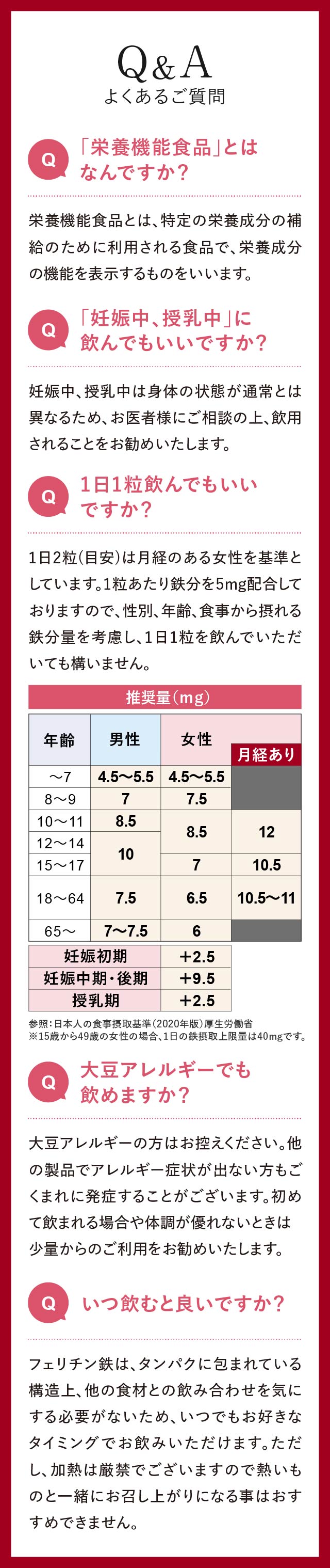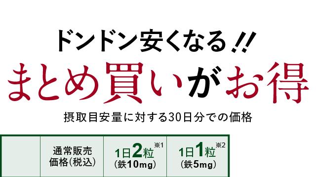 | お召し上がり方 | 1日1粒(鉄分5mg)〜2粒(鉄分10mg)を目安に水またはぬるま湯とともにお召し上がりください。 |