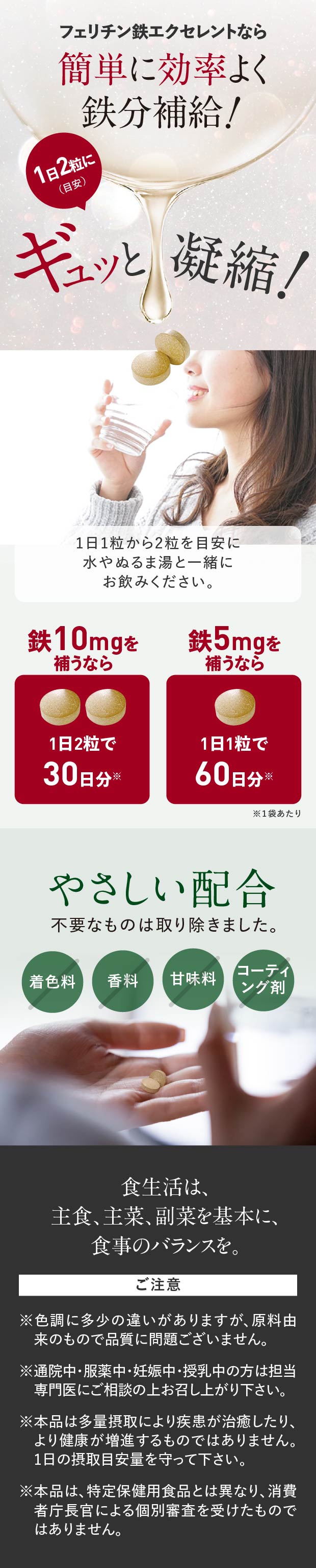 1日1粒(鉄分5mg)〜2粒(鉄分10mg)を目安に水またはぬるま湯とともにお召し上がりください。