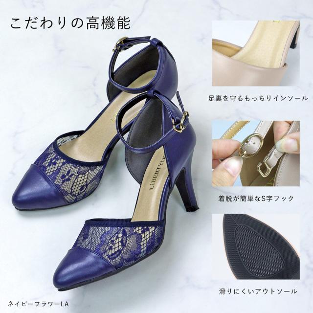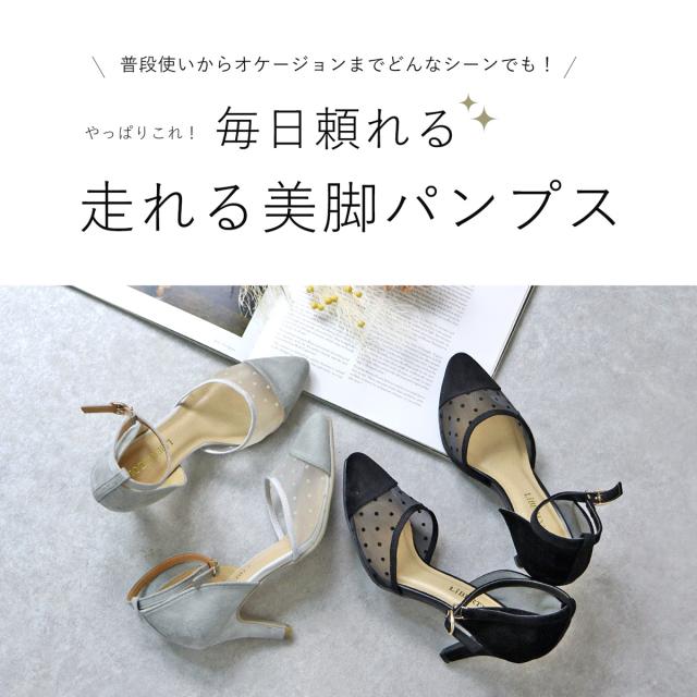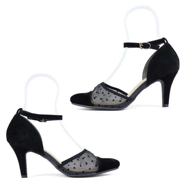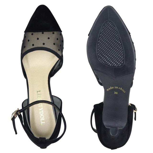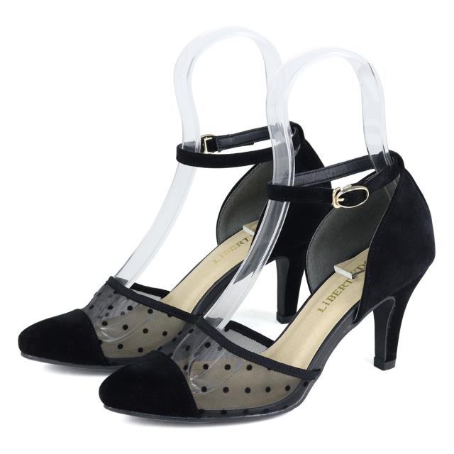 パンプス ストラップ 痛くない 黒 セパレート ハイヒール 8cm 透け感 チュール レース ブラック グレー ドット 低反発インソール ポインテッドトゥ 通勤 脱げない 走れる 22.0~25.0cm LiBERTYDOLL リバティードール No.5430