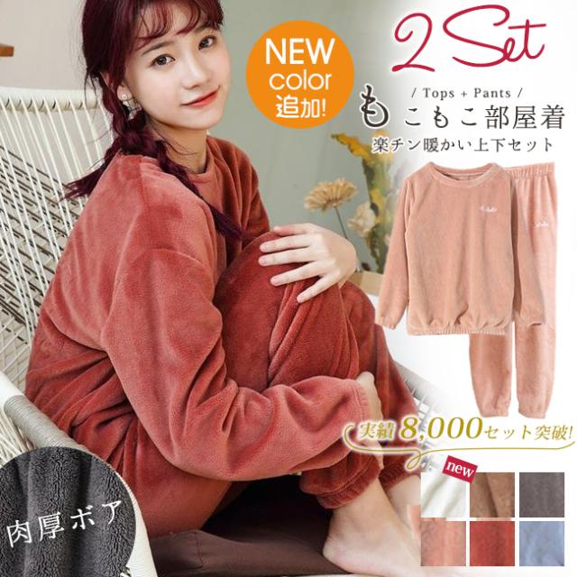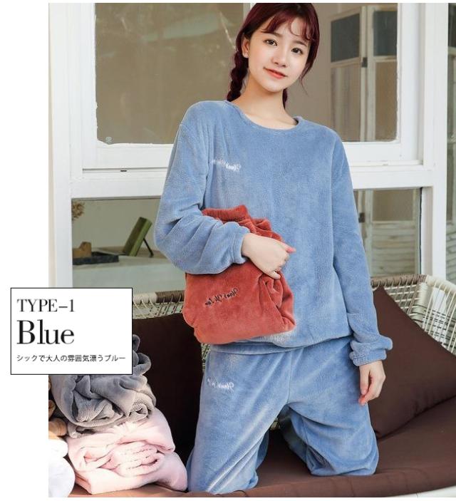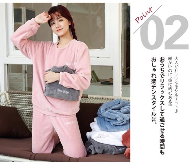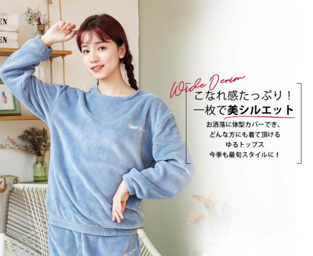 ルームウェア 上下セット もこもこ レディース パジャマ フリース マイクロファイバー 厚手 ゆったり 刺繍ロゴ 可愛い 冬 部屋着 長ズボン トップス 長袖 プルオーバー 襟なし ボア あったか 暖かい 防寒 おしゃれ セットアップ ナイトウェア 寝巻き ホームウェア 室内着 かわいい 2022 新作 新品 50代 40代 30代 20代 女性用 レディースパジャマ 長袖パジャマ 冬物