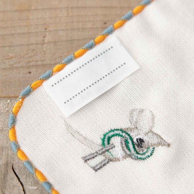 綿100%で、表はふわふわで優しい吸水性のあるパイル生地です。裏は通気性が良くて柔らかいガーゼ素材で汗を良く吸い取ってくれます。イニシャルとフレデリックの刺繍がワンポイントで入っていて可愛いです。
