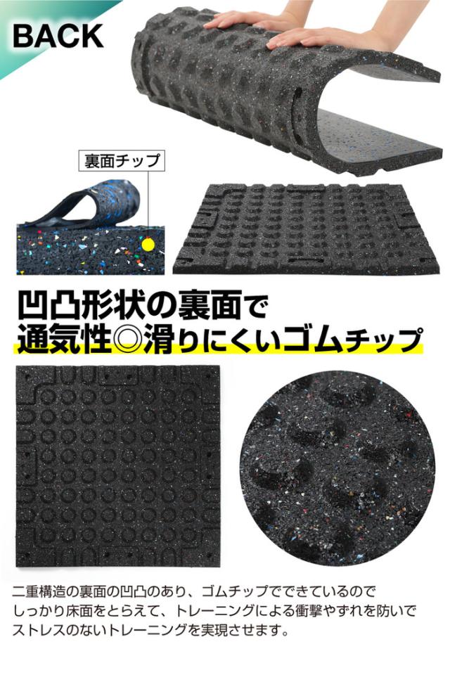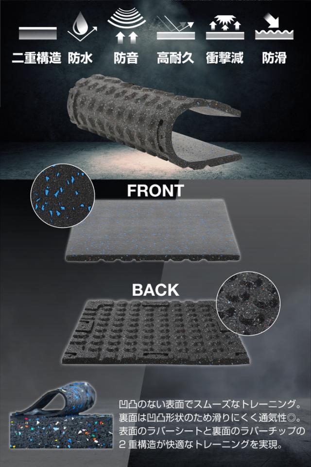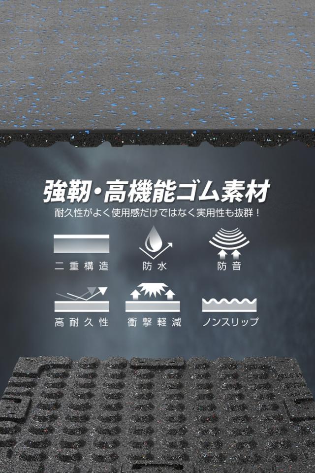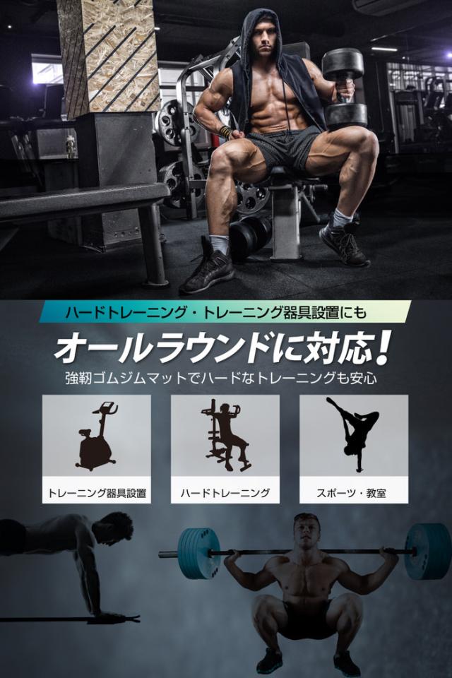 正方形のゴムマットを、使用したい場所のサイズに合わせて敷き詰めるだけ、レイアウトは自由自在。マット接続用コネクタ(※別売り)を使用して、マットの位置ズレを防ぎぴったりと敷き詰めることが可能です。手軽に使い勝手のいいトレーニングスペースが作れます。憧れの、 筋肉 マッチョ への近道。