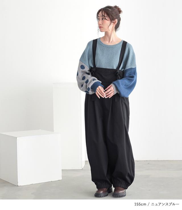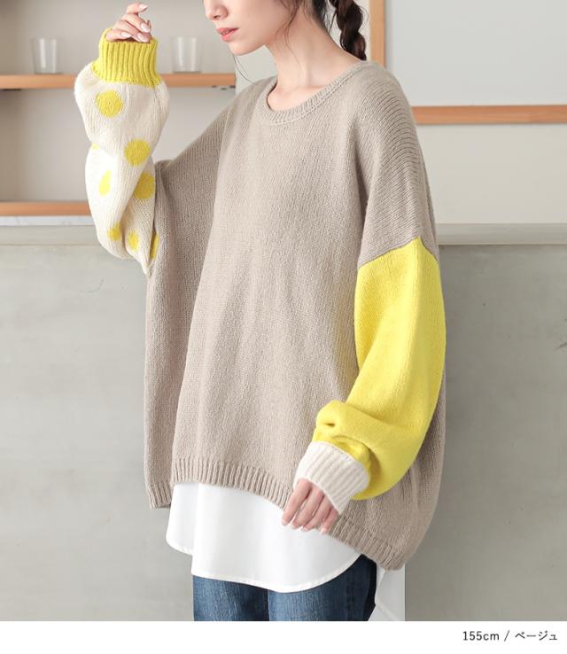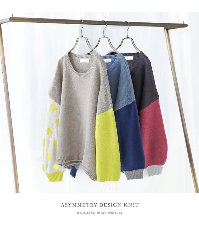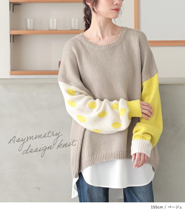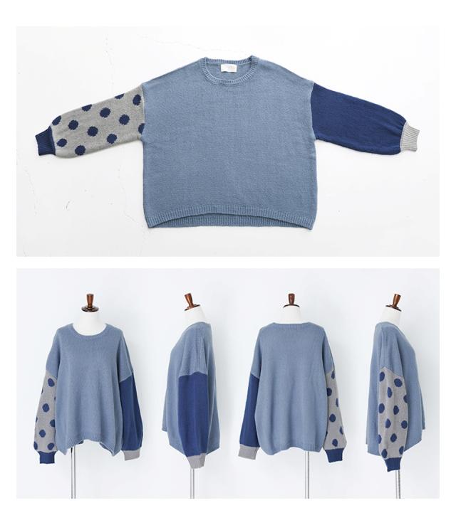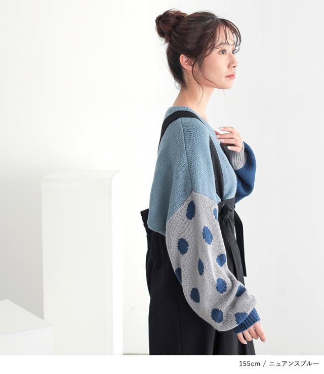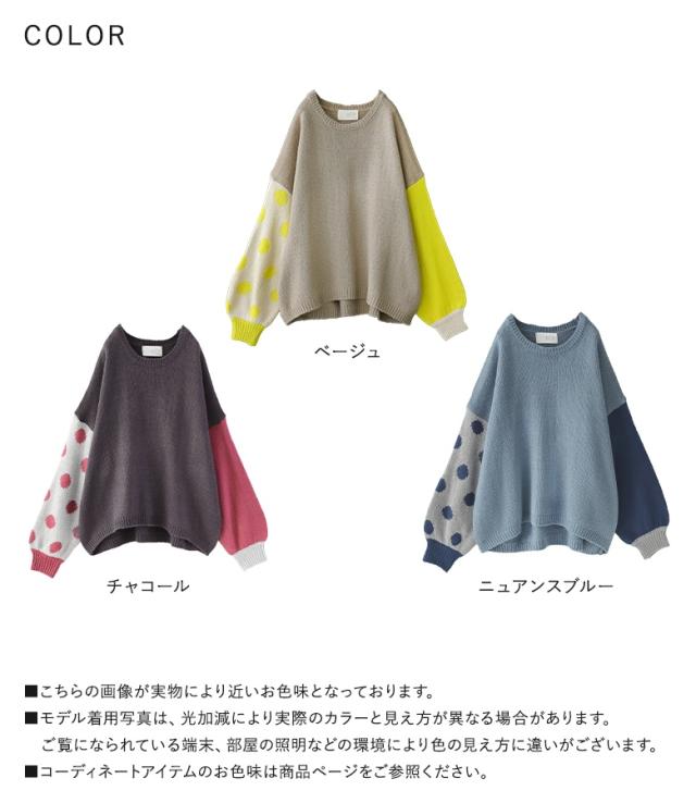 『ドット柄ジャカードローゲージニット』 【メール便不可】【30】[ニット レディース トップス 秋冬 セーター 長袖 クルーネック 無地 ドット柄 配色 アシンメトリー アシメ ジャカード ジャガード ローゲージ パフ袖 tin0316]