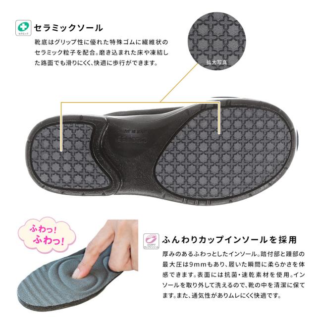 靴底はグリップ性に優れた特殊ゴムに繊維状のセラミック粒子を配合。