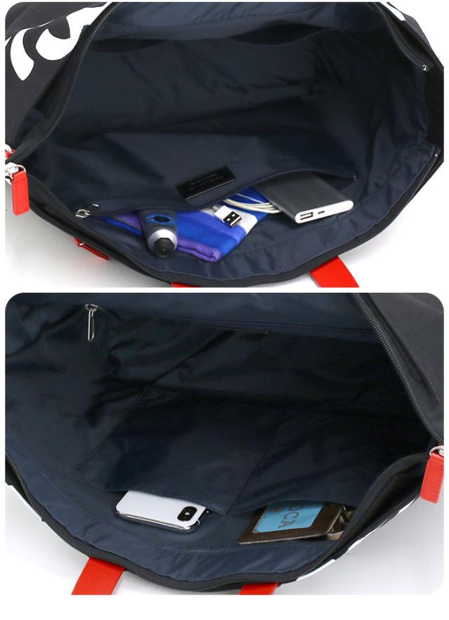 メインルームはA4サイズはもちろんB4サイズ対応で、一泊程の荷物が収納可能。内装に小物用のオープンポケットが2つと、背面にファスナーポケットが搭載し、小物の整理整頓に便利です。