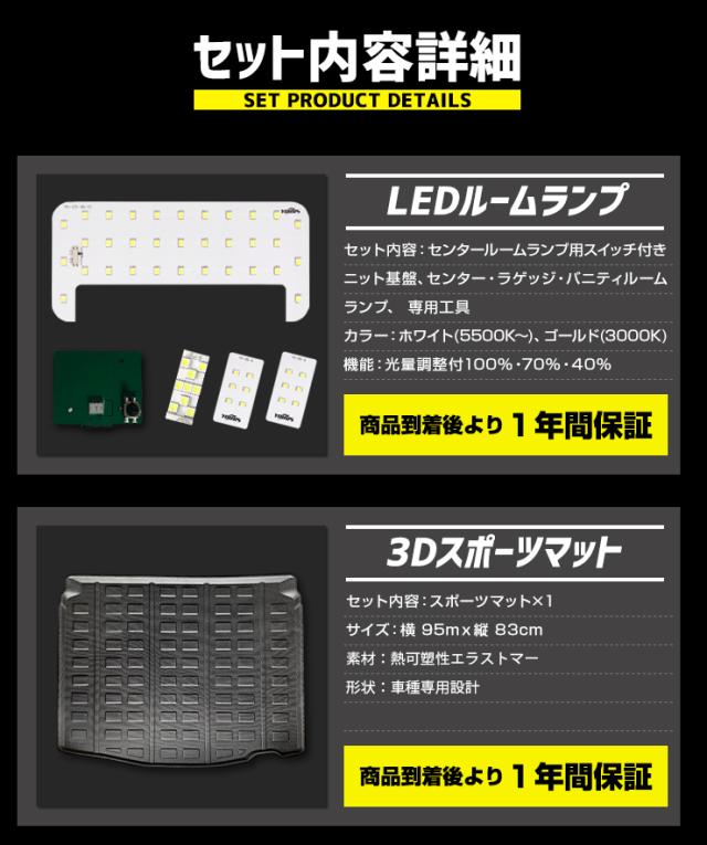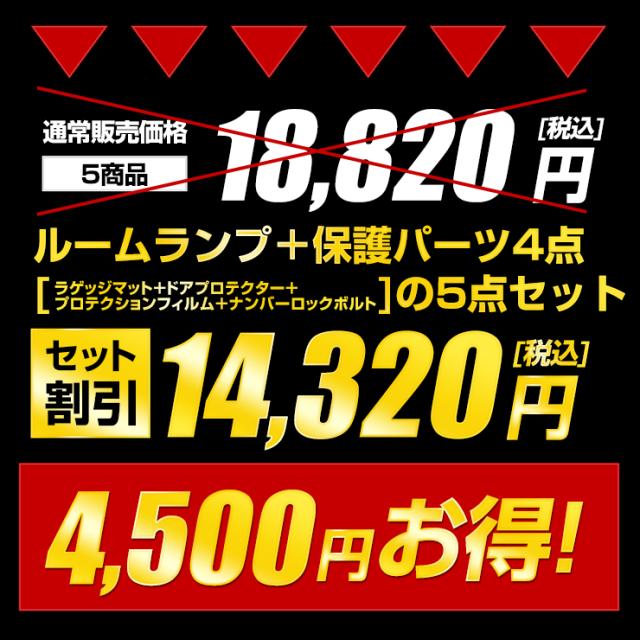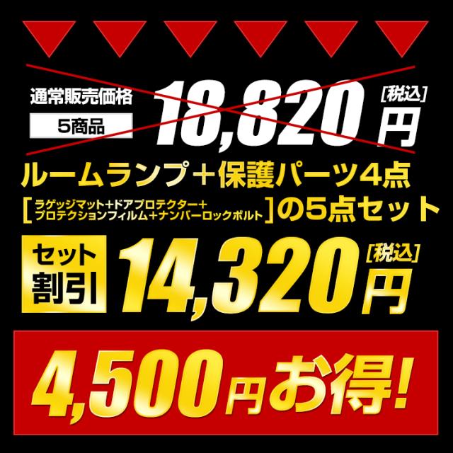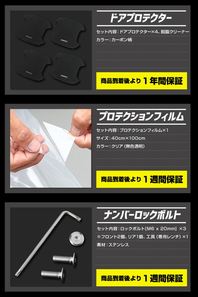 ■LEDルームランプ [1]センターランプ用スイッチ付きユニット基盤×1 [2]センタールームランプLED×1 [3]ラゲッジランプLED×1 [4]バニティランプLED×2 [5]専用工具 ■3Dスポーツマット [1]本体 1PCS [2]取扱説明書 ■ドアプロテクター [1]ドアプロテクター×4 [2]脱脂クリーナー ■プロテクションフィルム [1]プロテクションフィルム40cm×100cm ×1 ■ナンバーロックボルト [1]ロックボルト(M6×20mm) ×3 [2]専用工具 ×1 |
