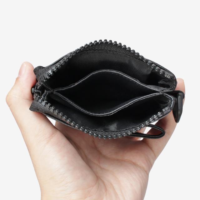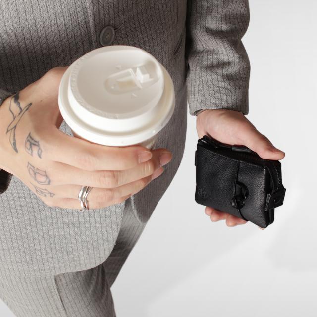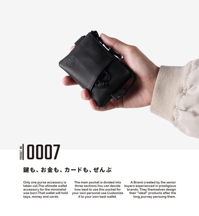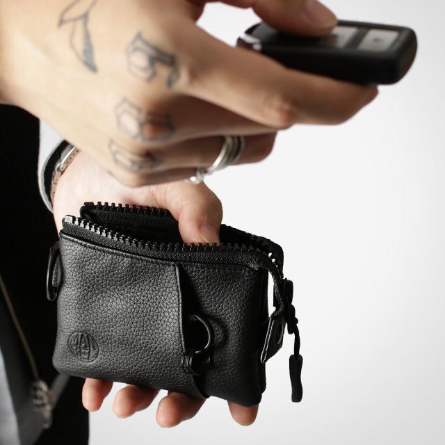 お金やカード、鍵やスマートキーも入る、理想的なマルチウォレット。三層構造のメインポケットは写真の例だけに限らず、使用者好みに工夫して収納していただけます。例えば、常備薬やUSBを収納したり、小銭の種類別に部屋を使い分けるのもオススメ。
