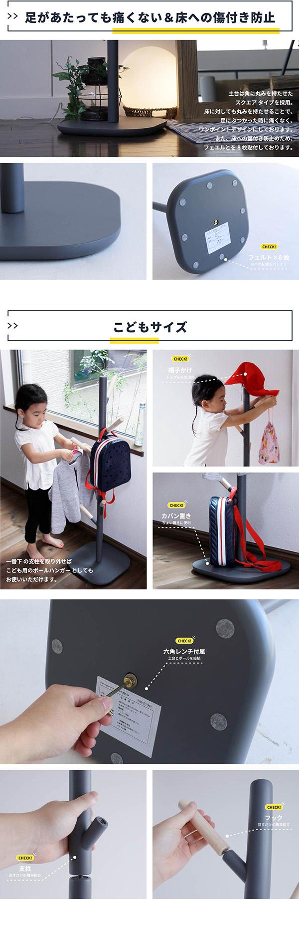 このポールハンガー、支柱部分が3分割の構造の組み立て商品になっており、その真ん中部のパーツを外すことでキッズサイズ仕様としてご使用も可能。子供の成長に合わせて永くご使用頂けます。
