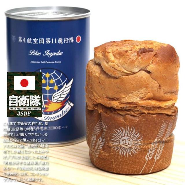 ブルーインパルスを象徴する「エンブレム」や英語表記の「部隊名」をラベルに冠した、缶詰タイプの非常用パン。