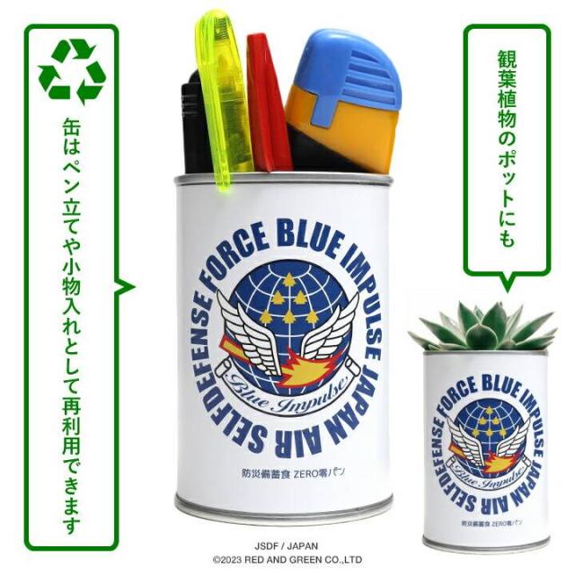 ブルーインパルスを象徴する「エンブレム」や英語表記の「部隊名」をラベルに冠した、缶詰タイプの非常用パン。