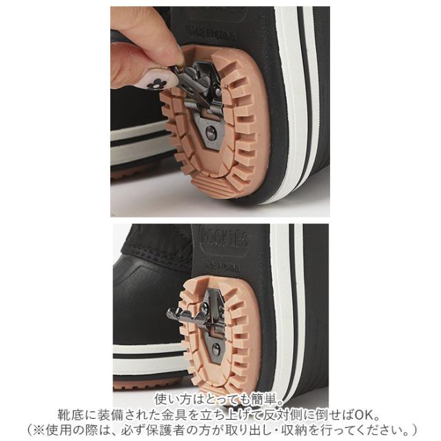 | 商品説明 | ・積雪のある場所や凍結した所から、キッズ&ジュニアを守ってくれるスノーブーツが「POOKIES」に仲間入り。 ・アウトドアファッションにピッタリな、まるでダウンジャケットの様なデザインが◎ ・フロントにはファスナーを採用し、キッズにも着脱しやすいのがポイント。 ・ブーツ背面には編み上げ式のドローコードを使用。足首をピッタリと包み、寒さをシャットアウト! ・ワンタッチスパイク付き靴底の採用により、雪の積もったゲレンデや雪道もバッチリ。 ・使い方はとっても簡単。靴底に装備された金具を立ち上げて反対側に倒せばOK。(※使用の際は、必ず保護者の方が取り出し・収納を行ってください。) ・さらに、靴底に貼られたゴムが雨や雪の日でも滑りにくくしてくれるので、安心。 ・ブーツ内部はつま先までボア貼りなので、あたたかくソフトな履き心地が魅力的。 ・軽量で足の疲れを軽減するEVAソールは、水深5cm程度までの完全防水機能を装備。雨や雪に強いのが嬉しい♪ |
