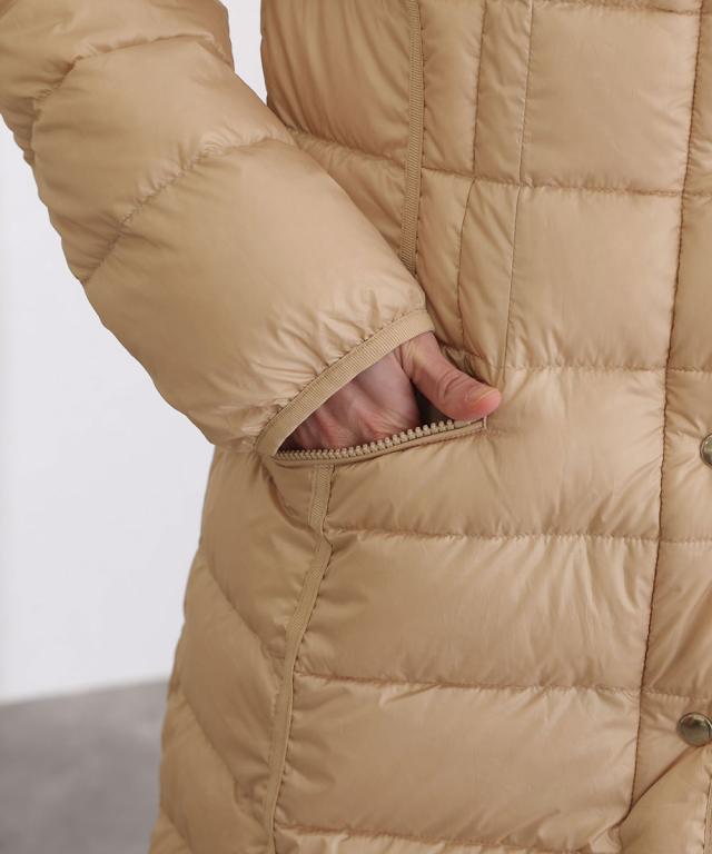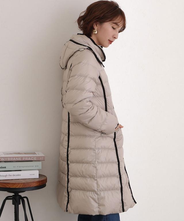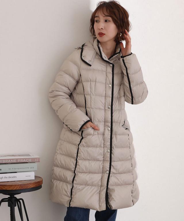 全体に施されたパイピングデザインが可愛いロングダウンコート。
