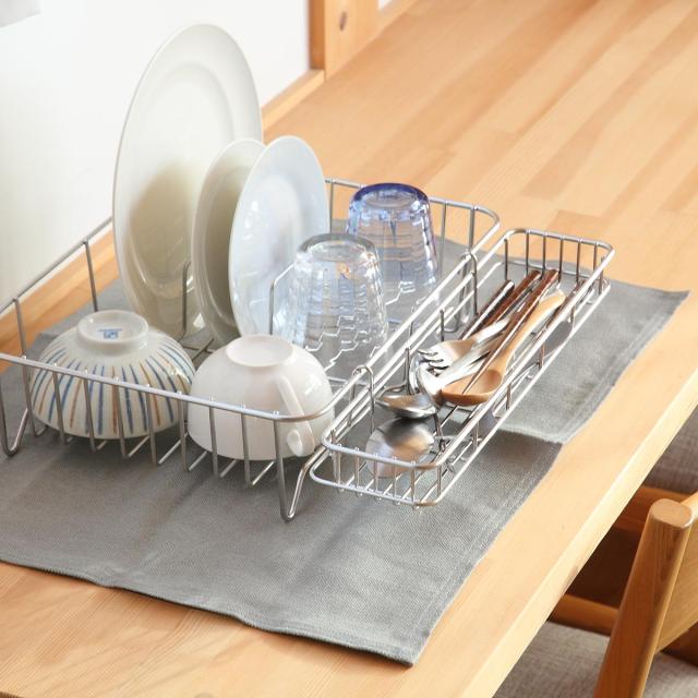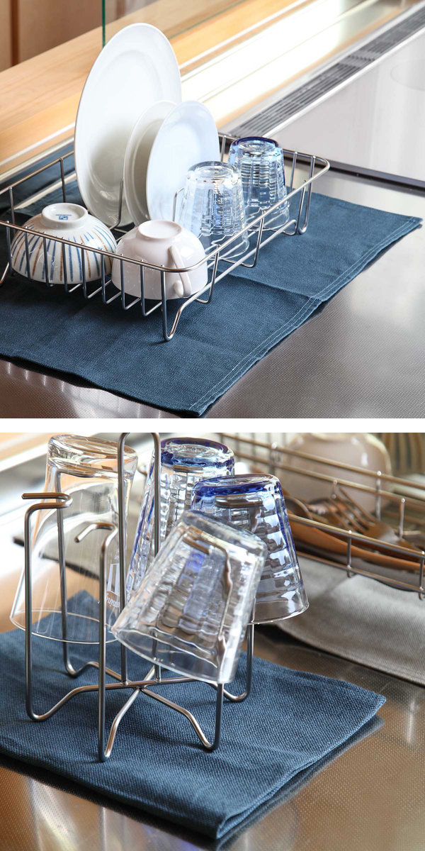 リネンライナーを敷いて水切りラックを使用すれば、リネンライナーが水をしっかり受け止めてくれます。落ちた水滴はリネンライナーが吸収してくれるので、シンクに隣接する場所で使用する必要がなく、好きな場所で使用することができます。