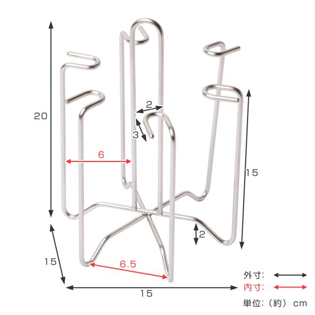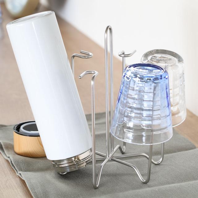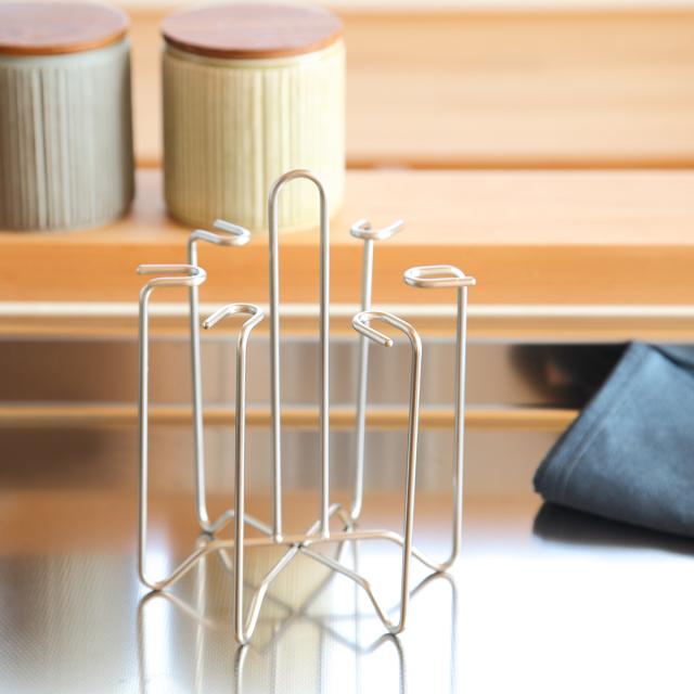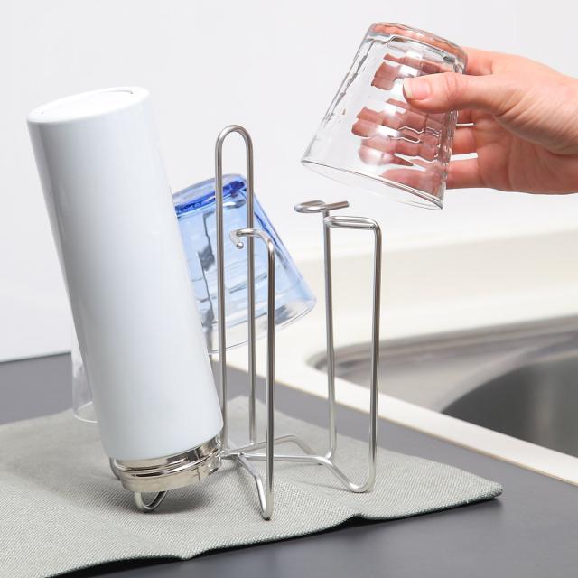 水筒などの水切りや収納に便利なボトルスタンドです。空間を多くとらず、コンパクト収納できます。シンク周りや調理台・カウンター上だけでなく収納スタンドとしても使用でき、棚の中でごちゃつきやすいグラスもすっきり収納できます。耐久性に優れたステンレス性で変形しにくく、サビにくい特長もあるのでお手入れが簡単で長く愛用していただけます。