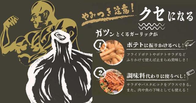 ●香ばしいガーリックをガツンと効かせ、食欲そそる風味の中に醤油の旨味を加えたお酒にもよく合うポテトシーズニングです。