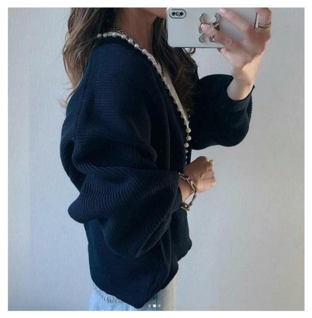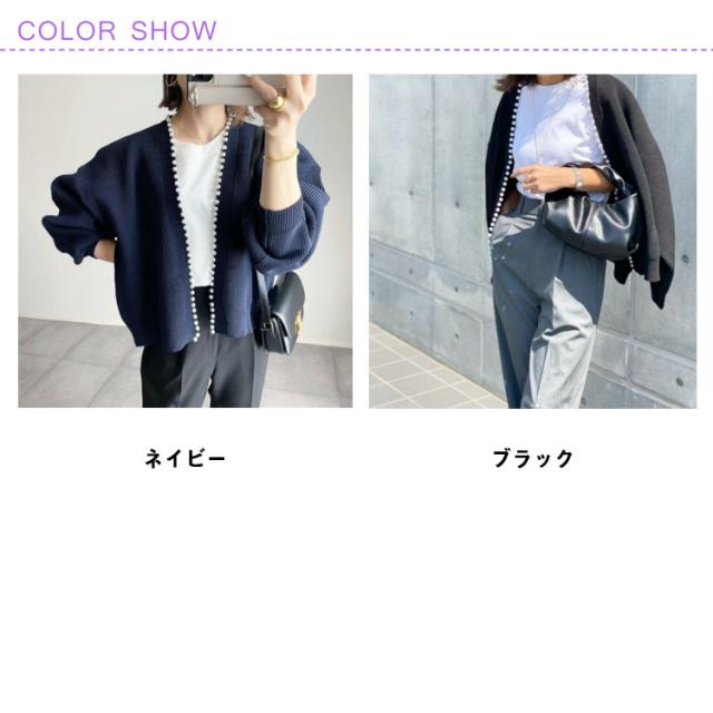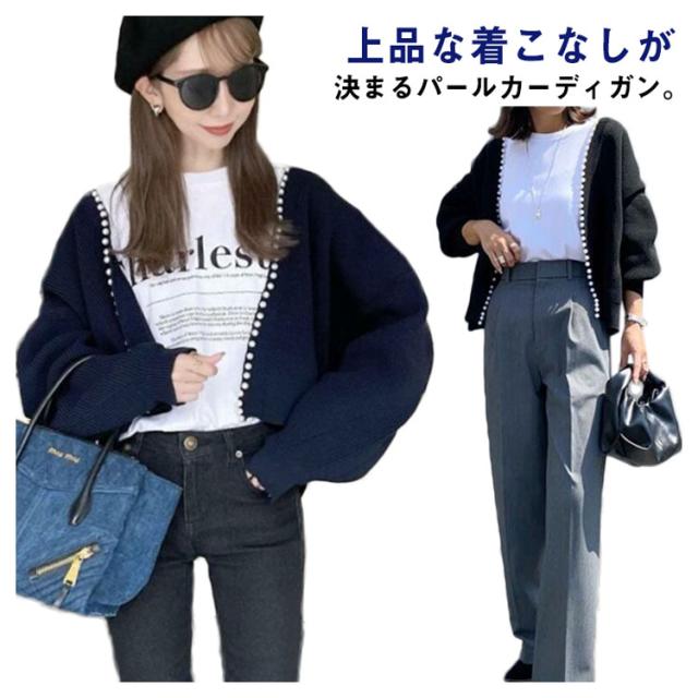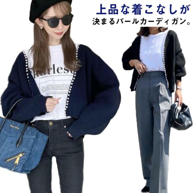 ニット カーディガン レディース パール パール付き ニットカーデ ニットカーディガン バルーンスリーブ ボリューム袖 ネイビー ブラック