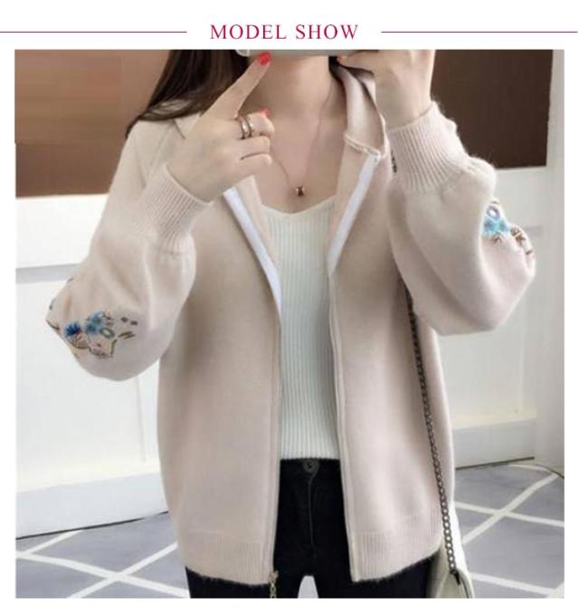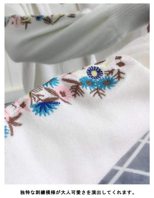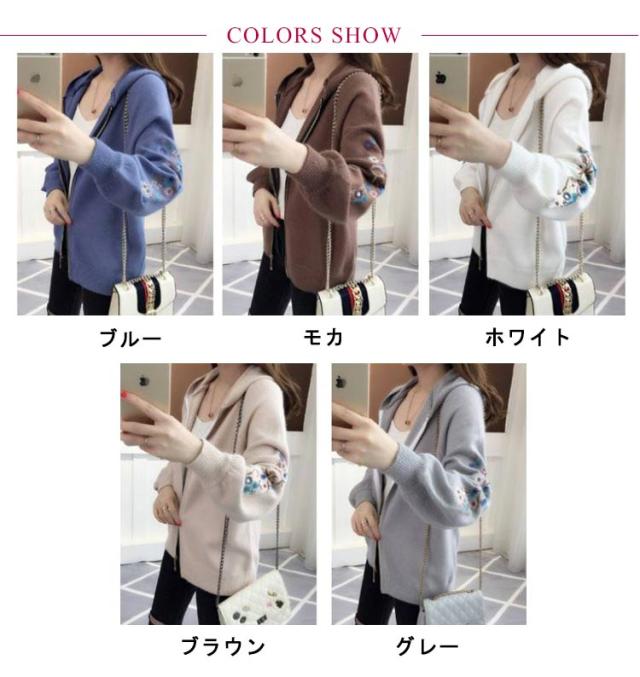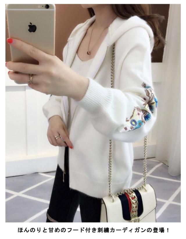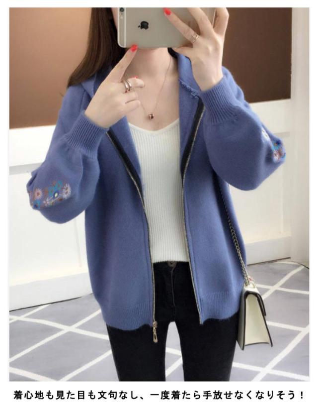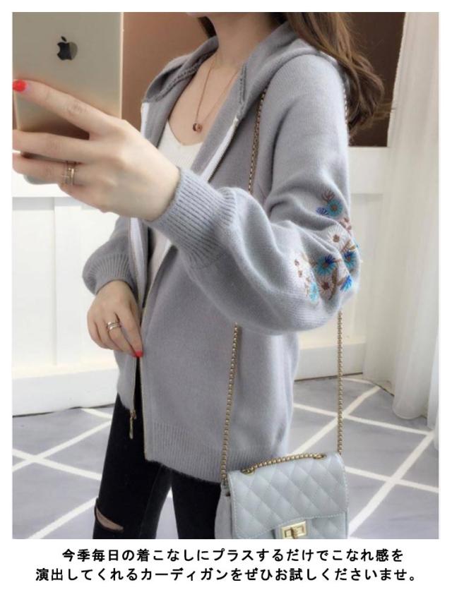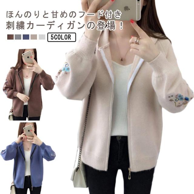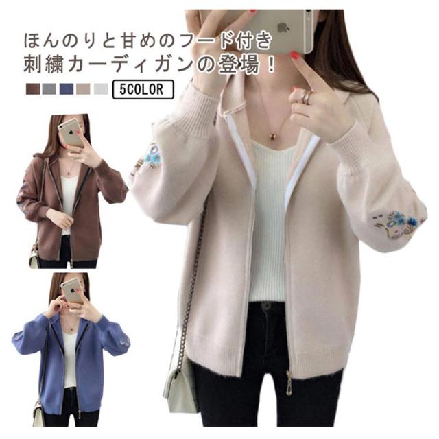 カーディガン レディース フード付きカーディガン 刺繍カーディガン ニットパーカー ジップアップ ニットカーディガン 長袖 ふんわり袖 刺しゅう ゆったり 通勤 通学 かわいい