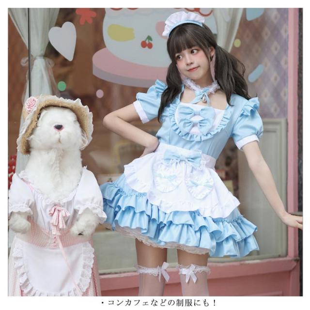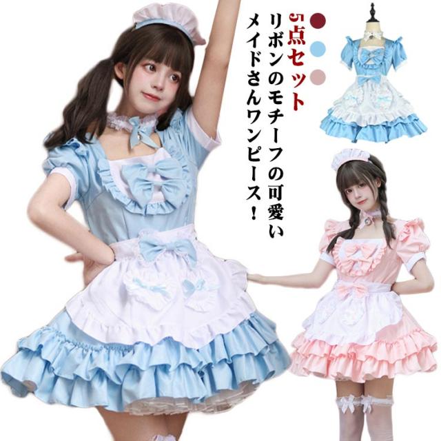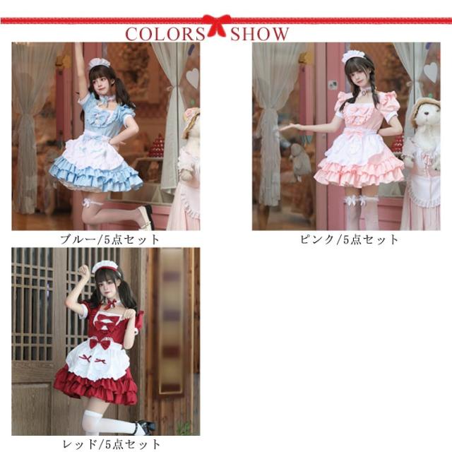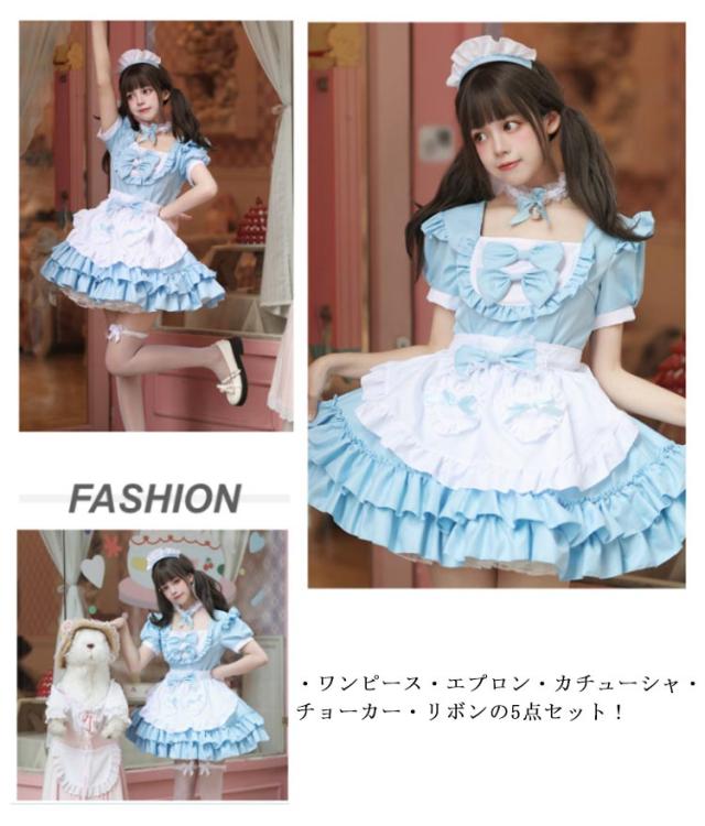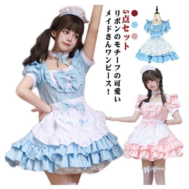 コスプレ メイド服ワンピース 5点セット ワンピース+エプロン+リボン+カチューシャ+チョーカー メイドコスプレ 半袖 フリル コスプレ用 仮装 コスチューム 大きいサイズあり イベント ハロウィン 全3色