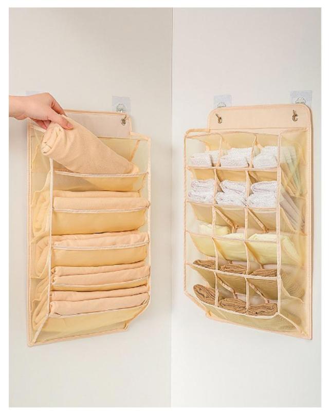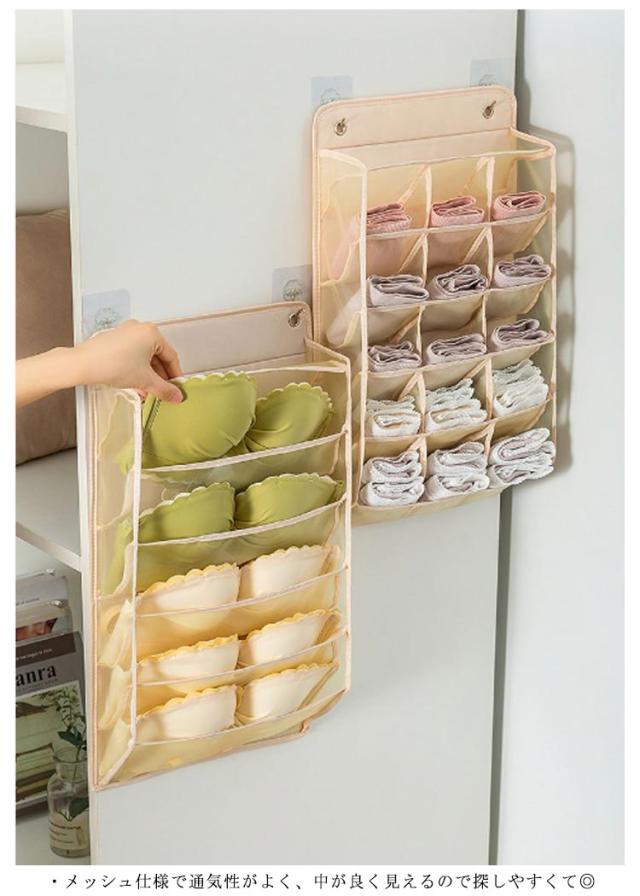 | ・下着などの小物をすっきり吊るして収納できる便利なウォールポケット。 ・出し入れしやすいポケット式で収納しにくい小物の整理に便利。 ・メッシュ仕様で通気性がよく、中が良く見えるので探しやすくて◎ ・壁掛けタイプで、押入れ、クローゼットなど使い場所次第、ご利用しただけます。 ・使わない時も折り畳むことができ、コンパクトで省スペースとなります。 | |