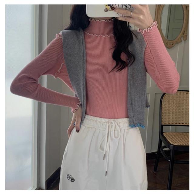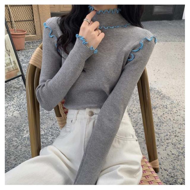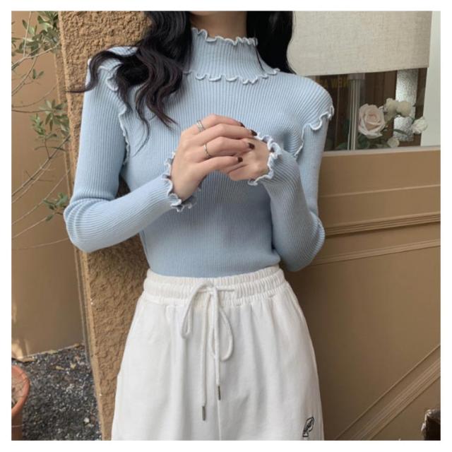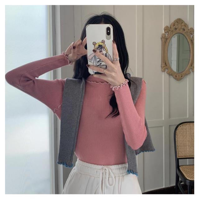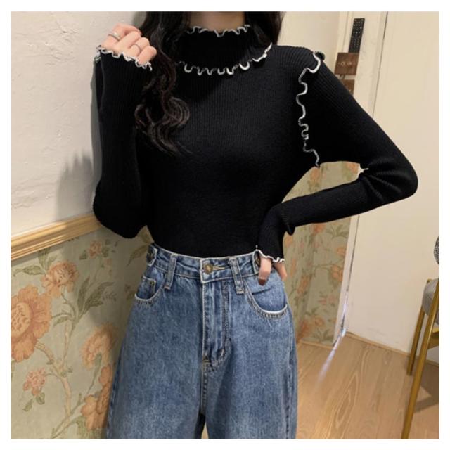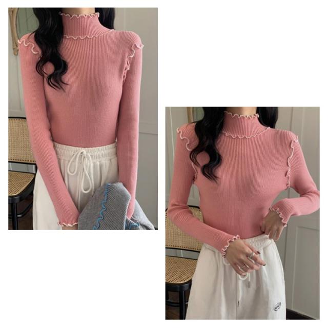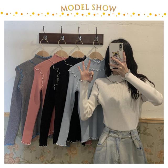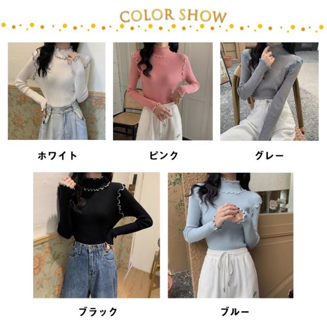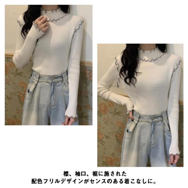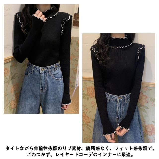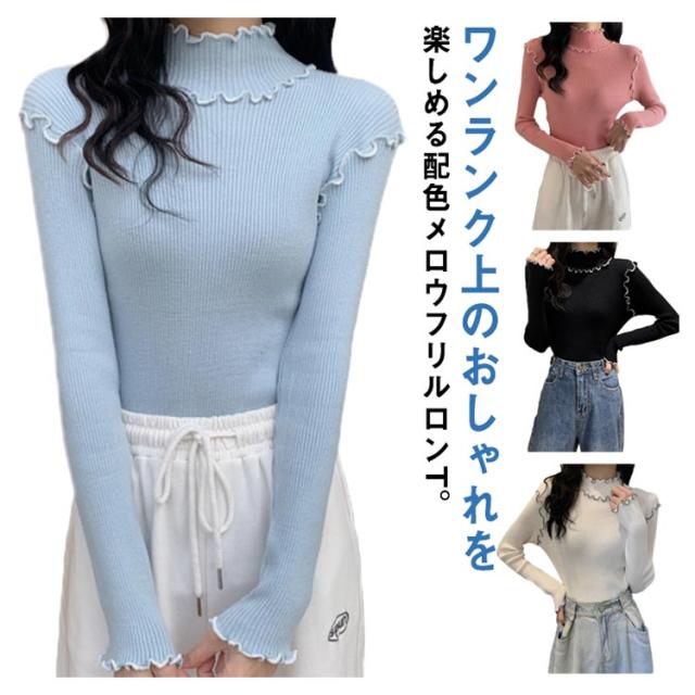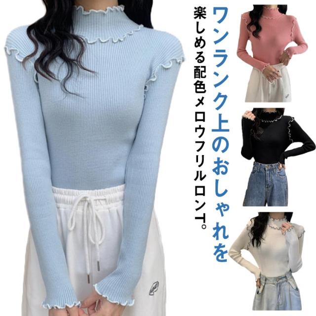 配色メロー カットソー リブ ニットソー ロンT ハイネック 長袖 トップス Tシャツ レディース 送料無料 フリル 可愛い メロウフリル インナー 重ね着 バイカラー 秋 冬 服