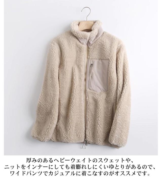 | 汎用性抜群な毎年大人気のボアブルゾン登場! 身幅やアームホールなどにゆとりを持たせた、リラックスシルエットのスタンドカラージャケットです。 パイピングデザインやポケット、襟の別布に配色を施し、シンプルで合わせやすいデザインです。 内側にはフリースを使用し、秋冬の厳しい寒さにも対応可能。 着回し力抜群なカラー4色展開で、幅広い年代の方にオススメです。 表地はモコモコのボア素材、裏地は滑らかなフリース素材により着心地と暖かさ、軽さを兼ね備えています。 ご自宅でお手入れ可能なのも嬉しいポイントです。 厚みのあるヘビーウェイトのスウェットや、ニットをインナーにしても着膨れしにくいゆとりがあるので、ワイドパンツでカジュアルに着こなすのがオススメです。 配色切り替えのカラーと合わせた差し色コーデでも様になります。 アウトドアやキャンプなどのレジャーシーンにも重宝します。 女性のオーバーサイズの着用もオススメです。 | |