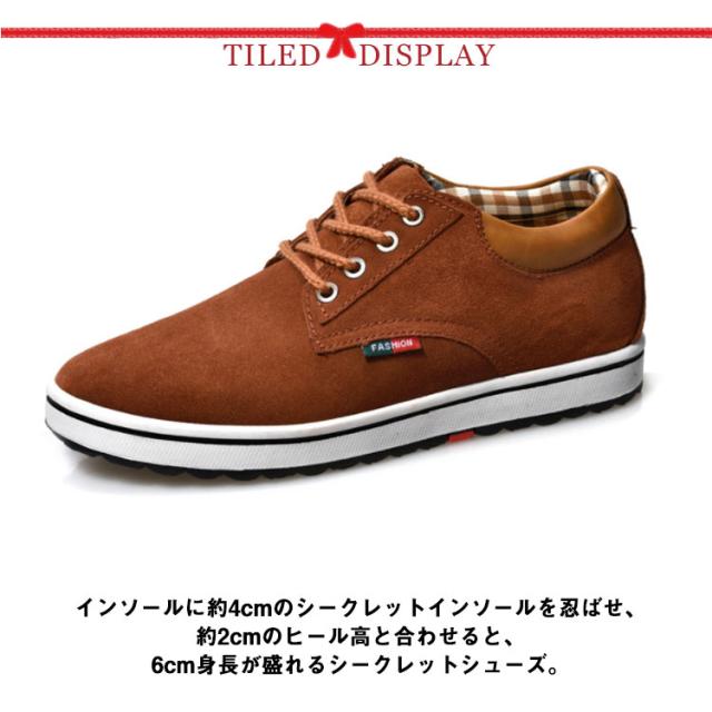| 良質な素材感とシンプルなデザインで大人のコーデを演出するスエードシークレットシューズ(6cmUP)です。【裏起毛と裏起毛なし2タイプあり】 インソールに約4cmのシークレットインソールを忍ばせ、約2cmのヒール高と合わせると、6cm身長が盛れるシークレットシューズ。 外観は一般的なビジネスシューズに見えますが、履くだけで身長UP効果が実感できるすぐれもの!! アッパーは上品で高級感のあるスエード素材を使用。 インソールは人体工学に基づいて設計されて人間の足型にぴったりでよい走り心地になります。 不自然なカカトの高さがなく、至って普通の靴と同じシルエット。見た目の自然さはもちろん、履き心地にもこだわってプラス6CMのインヒールシューズは、飽きのこないシンプルさと使いやすいデザインで多彩なシーンで重宝する相手となってくれるそうです。 アウトソールにはゴムを使用して丈夫でつかれにくく、また滑りにくいソールになっております。 普段履きはもちろん、通勤、通学、結婚式、パーティー、冠婚葬祭、就活、面接、成人式、入学式、卒業式、新生活、出張、等様々なシーンでご利用いただいています。 | |