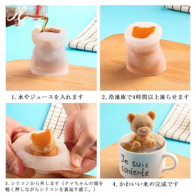 | ・可愛いクマの形の氷が作れるシリコンの型になります。 ・ころんと浮かぶくまさん型の氷は見ているだけで涼しげに♪ ・飲み物に合わせて、色んな素材で氷を作れば色合いもおしゃれですよ。 ・氷の他にもお菓子やゼリーの成形型としてもピッタリ! ・お家でカフェ気分を味わえちゃうユニークなキッチンアイテムです☆ 1.水やジュースを入れます 2.冷凍庫で4時間以上凍らせます 3.シリコンから外します(クマちゃんの頭を軽く押しながらシリコンを裏返す感じ。) 4.かわいい氷の完成です | |
