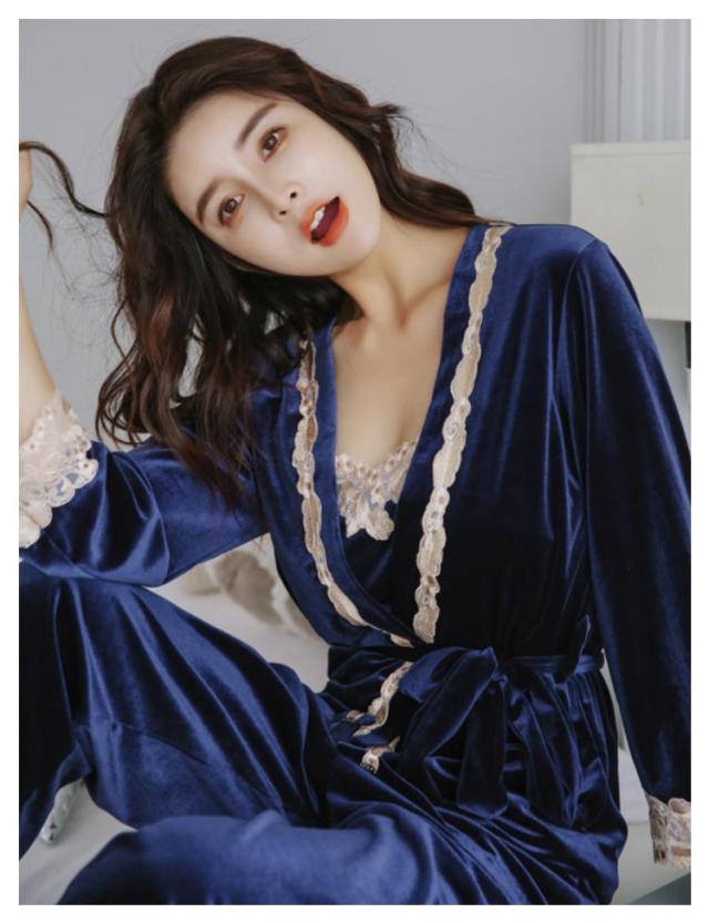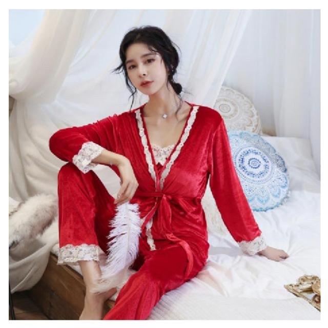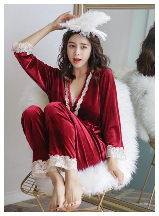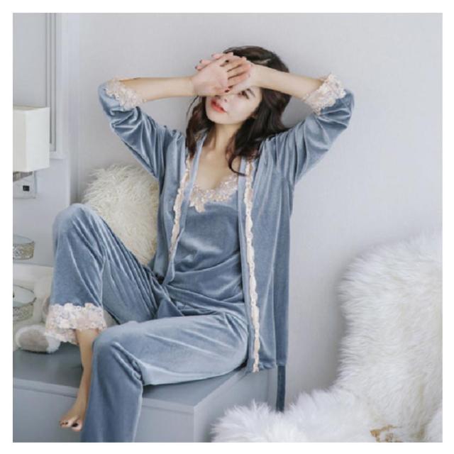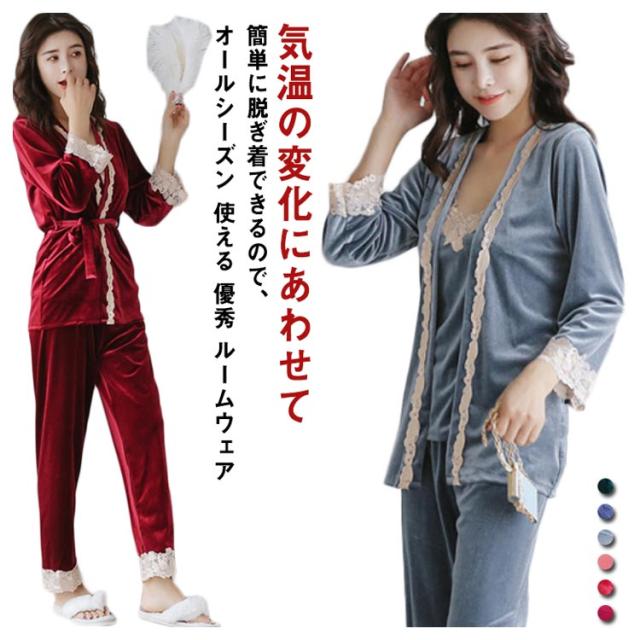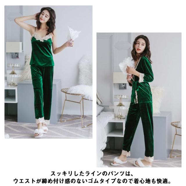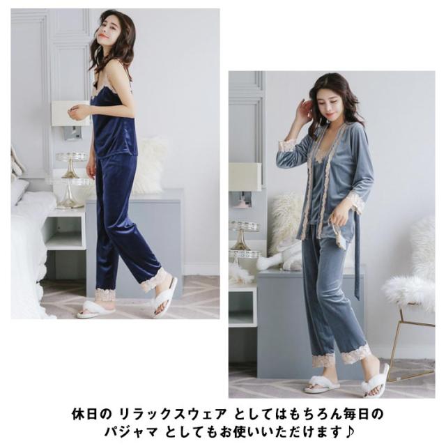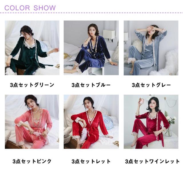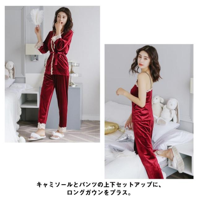 選べる6色!ルームウェア パジャマ レース付き ベルベット セット ナイトウェア 3点セット ガウン キャミソール パンツ ルームウエア ベロア レース 光沢 レディース 上下セット