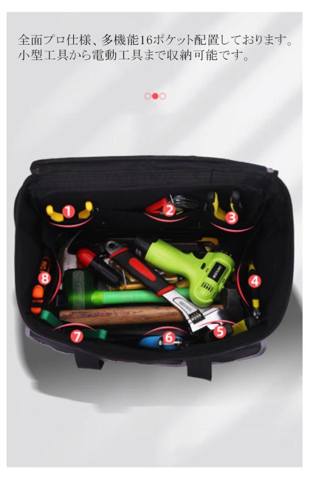 | 【大容量】全面プロ仕様、多機能16ポケット配置しております。小型工具から電動工具まで収納可能です。 【耐摩耗抜群】600D高密度オックスフォードを採用しています。強化縫製でしっかりと仕上げられ、耐荷重、耐摩擦、耐久性に優れてます。 【足置き台付き 】 ツールバッグを支える役割だけでなく、地面と2センチの隙間を作るので、劣悪な工場現場との直接接触を避けることも出来ます。 【多用途】工具入れベルトは様々な道具や工具の収納、携帯に、仕切りがついており大変便利です。ガーデニング、釣り、工芸、建築、大工、請負業者、屋根、ラインマン、石工、鉄工などの作業を携わる人に最適にします。日常生活のDIY活動だけでなく、自動車修理、木工および専門な修理活動も最適です。 【強化持ち手】持ち手は重さをバランスにして手に優しいです。 【 ファスナー】特にデザイン性と実用性は徹底的にこだわり、開閉のしやすさと、長くご使用頂けます。 | |