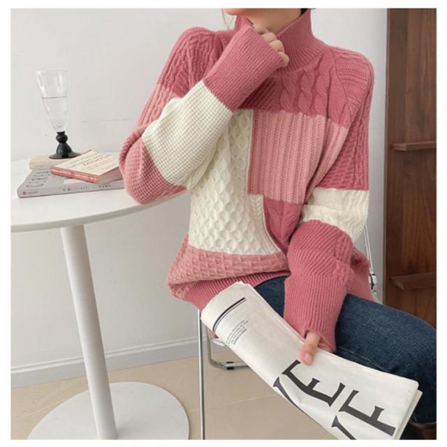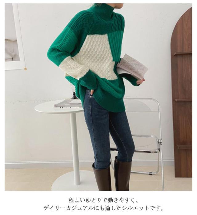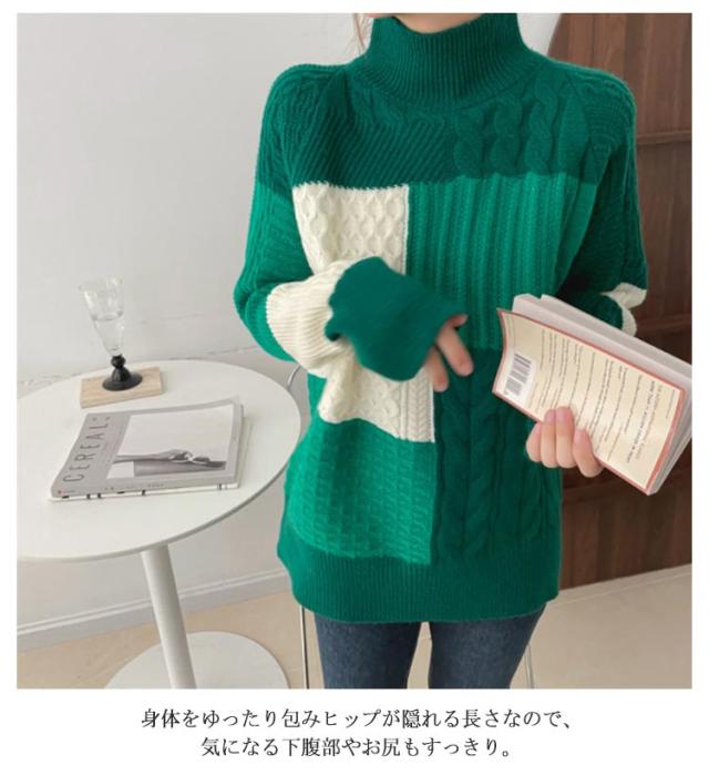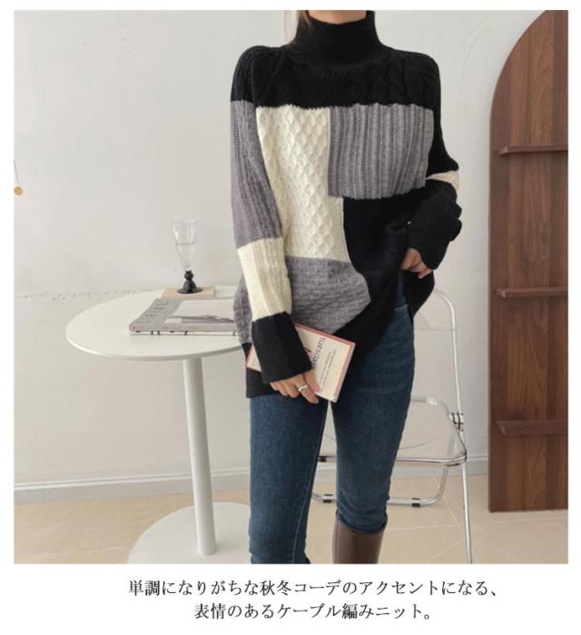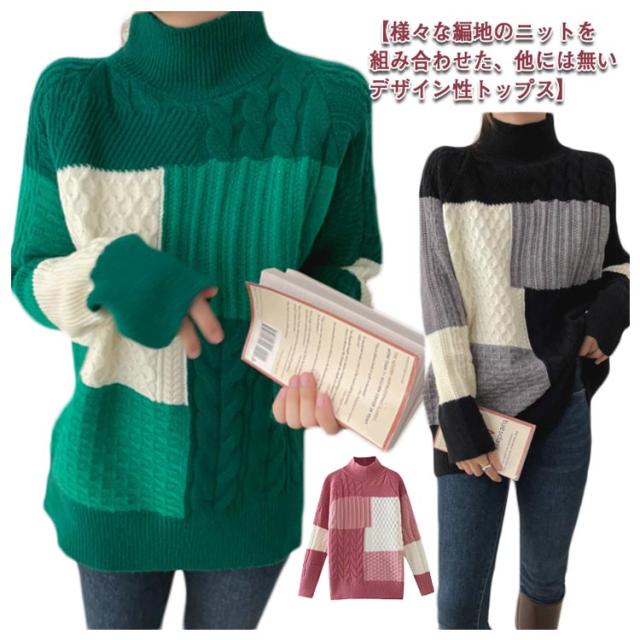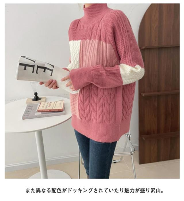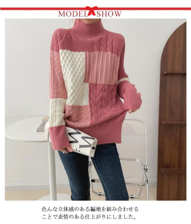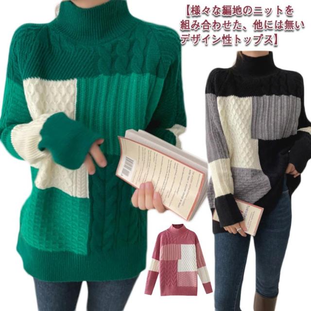 【送料無料】ニット セーター 長袖 パッチワーク ニット トップス 秋 冬 レディース ニット プルオーバー ハイネック ボトルネック ケーブル編み セーター ゆったり お尻が隠れ 通勤 OL カジュアル 20代 30代 40代 50代