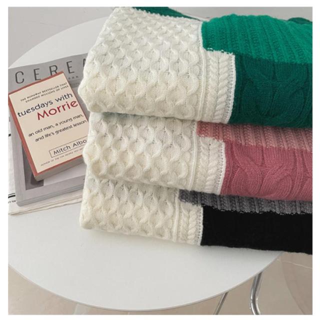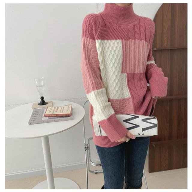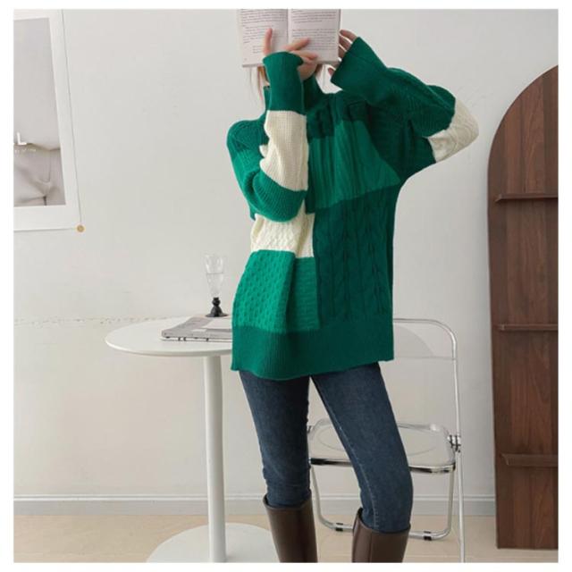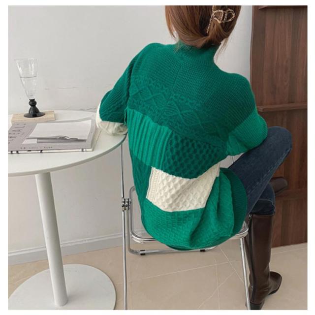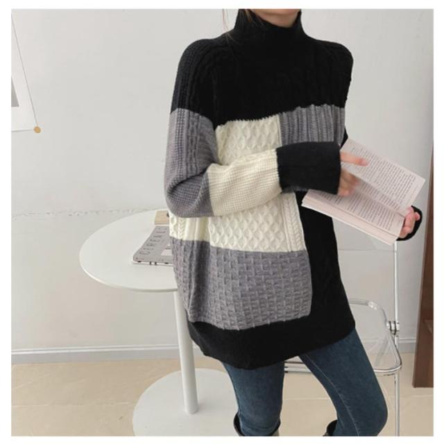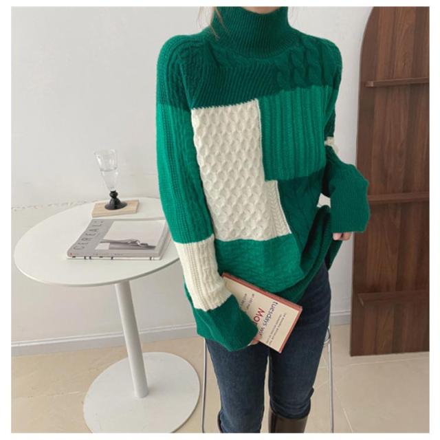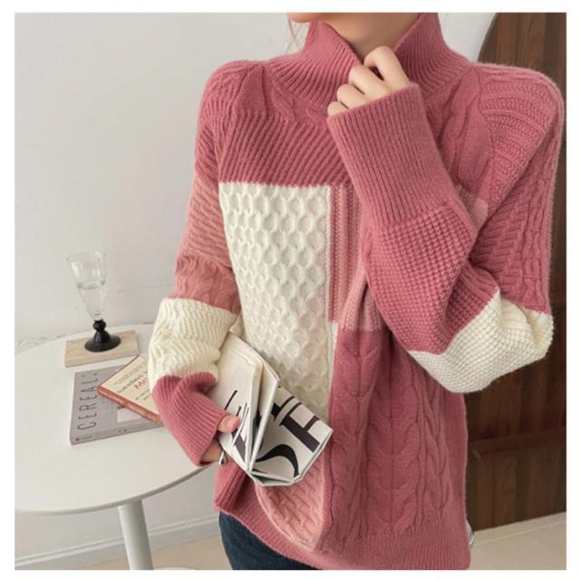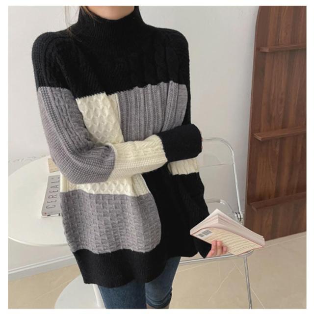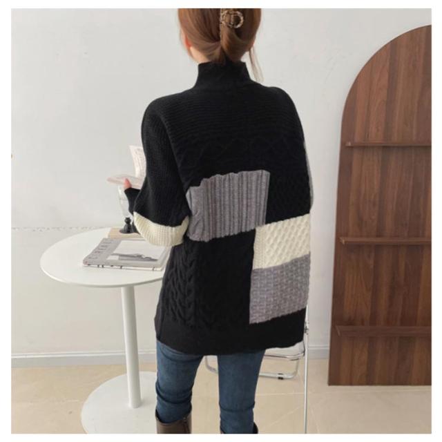 【送料無料】ニット セーター 長袖 パッチワーク ニット トップス 秋 冬 レディース ニット プルオーバー ハイネック ボトルネック ケーブル編み セーター ゆったり お尻が隠れ 通勤 OL カジュアル 20代 30代 40代 50代