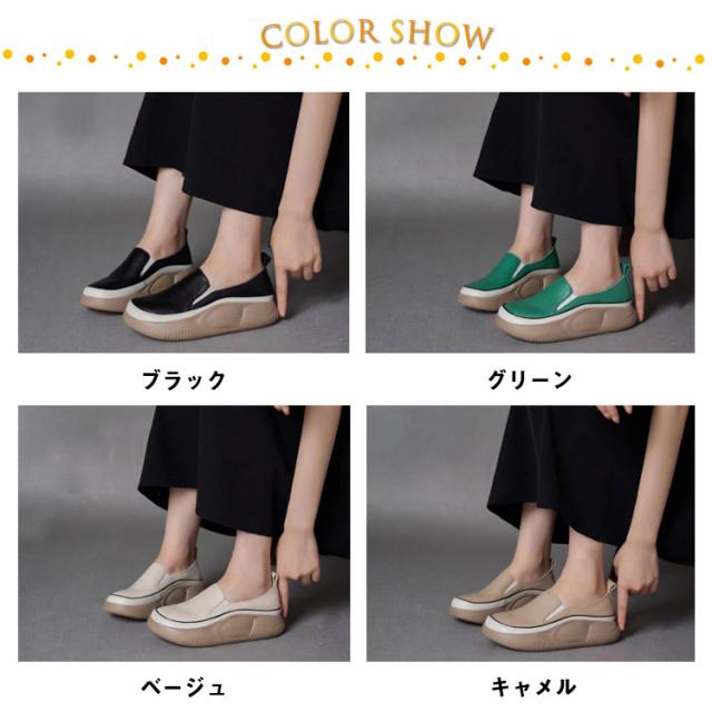 | さっと履き脱ぎやすく、スタイルアップが叶う厚底スリッポン。 毎日でも履きたい定番スリッポン、素敵な色合いがコーデをえらばない。 厚底なのに軽くて、足へ負担をかけない。キレイなシルエットがカジュアルでもキレイめでも合わせやすい。 歩きやすい船型底、クッション性と衝撃吸収性に優れるソール、足の痛みを防ぎます。 耐摩耗性に優れたゴム底、滑りにくく、旅行やショッピングでも、足が疲れず快適に過ごせるので、安全で快適な歩行を実現します。 | |