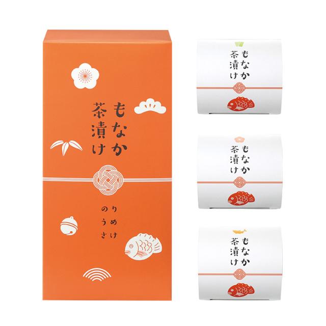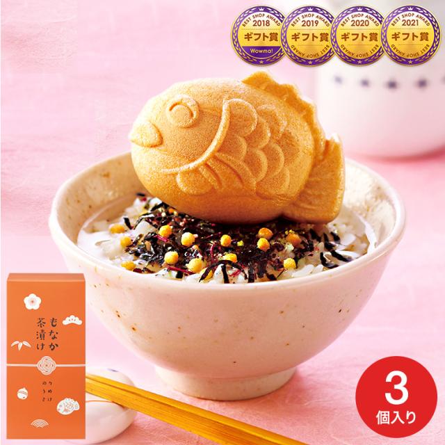 にっこり笑った鯛型もなかで、磯のかおりとあられの香ばしさが漂うのり茶漬け、しその酸味が食欲をそそるうめ茶漬け、旨味が詰まった鮭フレーク入りのさけ茶漬けを包みました。もなかの皮はモチモチ食感で食べ応え抜群。思わずほっこりするおめで鯛(たい)シーンにピッタリの贈り物です。