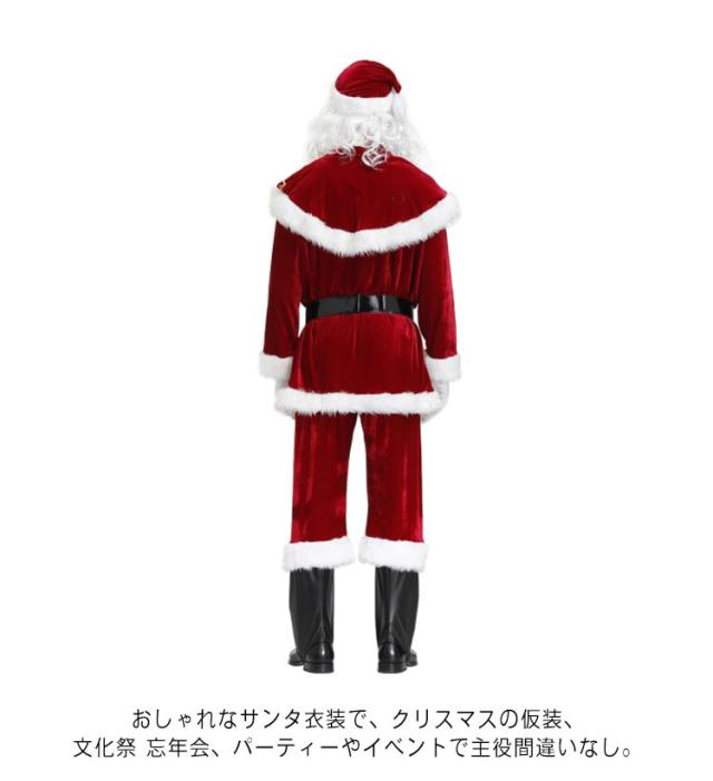 | 高級感のある質の高いサンタクロース衣装。 肉厚の高品質なベルベットを採用し、透けない肌触りよく、通気性も◎上品な光沢感もこだわりです。 裾などには毛足の長いふわふわ、ディテールまでこだわった作り。 サンタ帽子+ケープ+ジャケット+ズボン+ベルト+靴カバー+手袋+髭+白かつらの豪華な9点セット。お手軽でお得に本格的なサンタクロースに変身できます。 おしゃれなサンタ衣装で、クリスマスの仮装、文化祭 忘年会、パーティーやイベントで主役間違いなし。 | |
